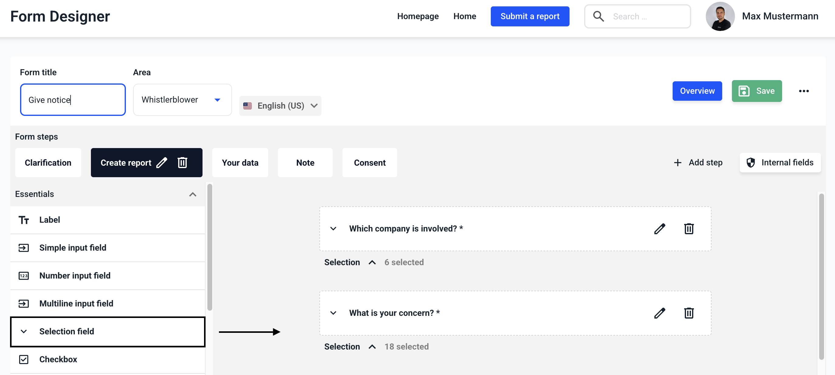 Select a selection field in the field selection and drag it into the form with the mouse.