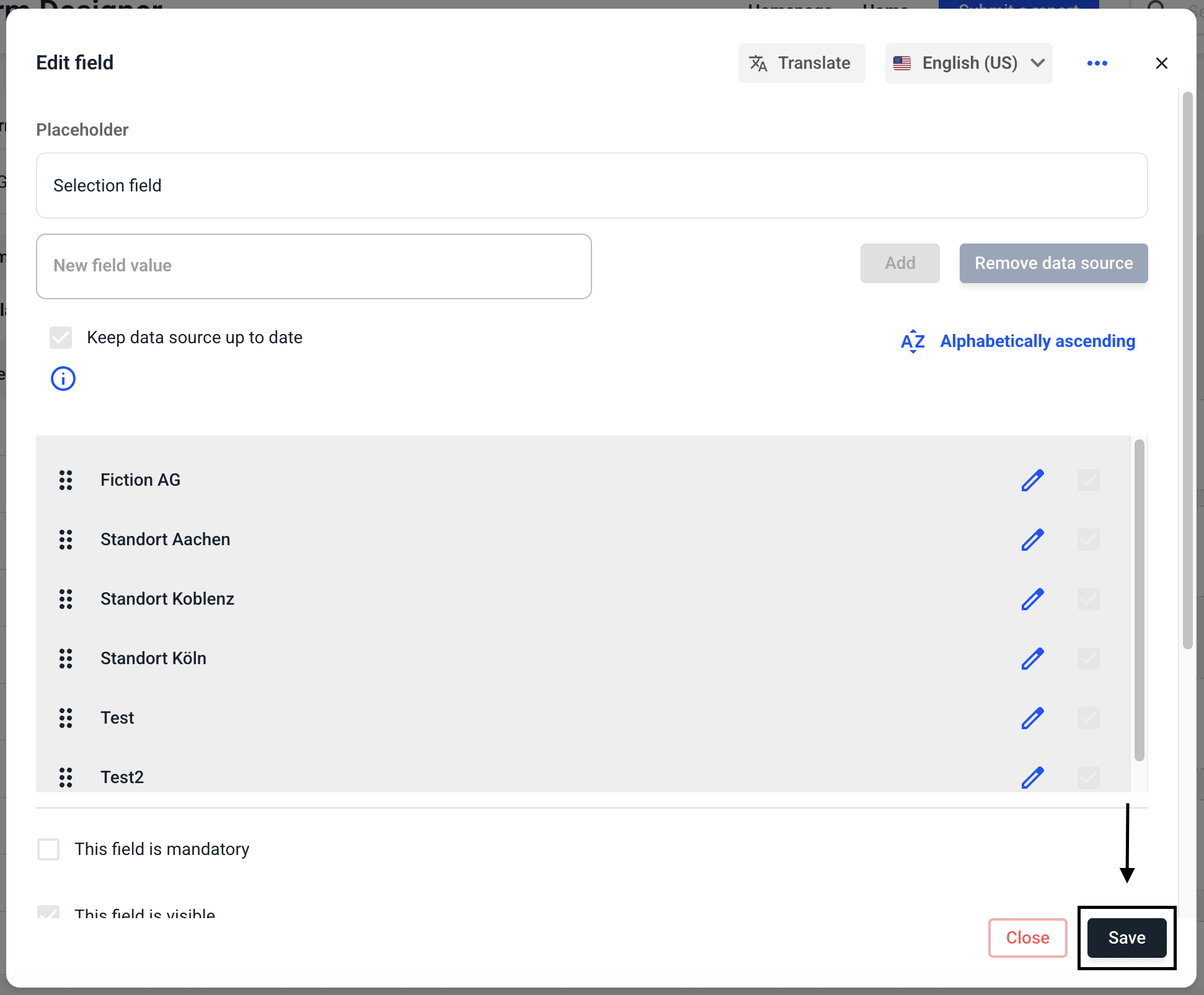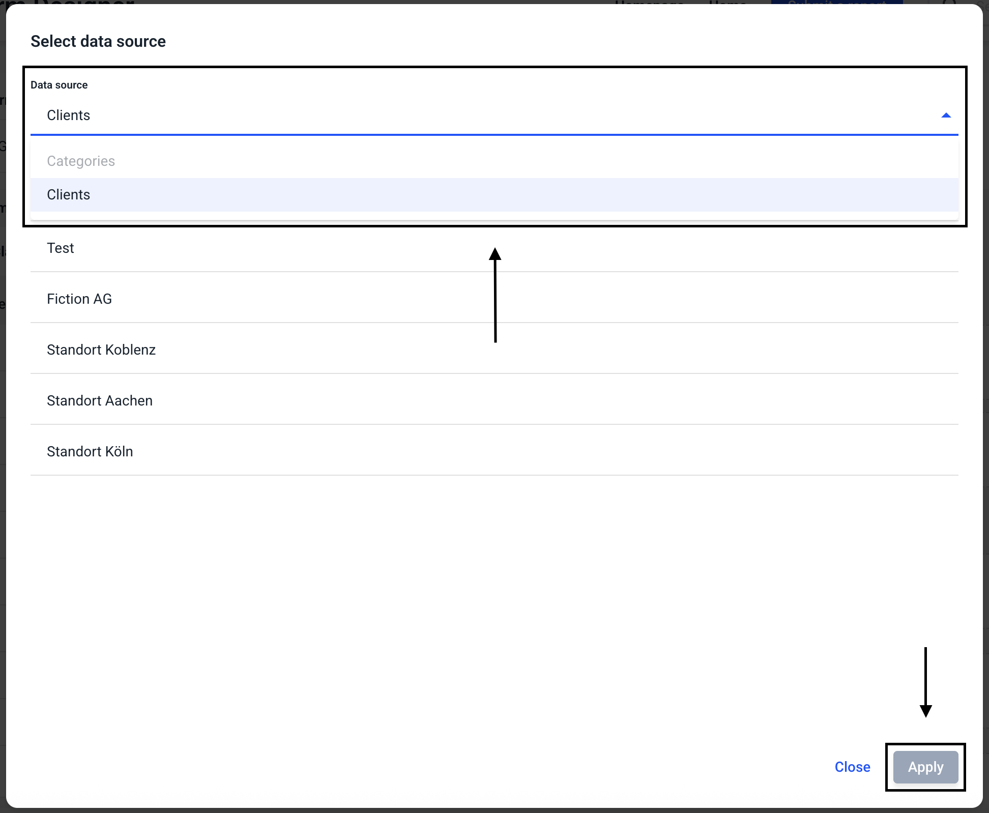 The clients have been added to the selection field. To automatically apply changes in the client management in the form, click on the Keep data source up to date checkbox.