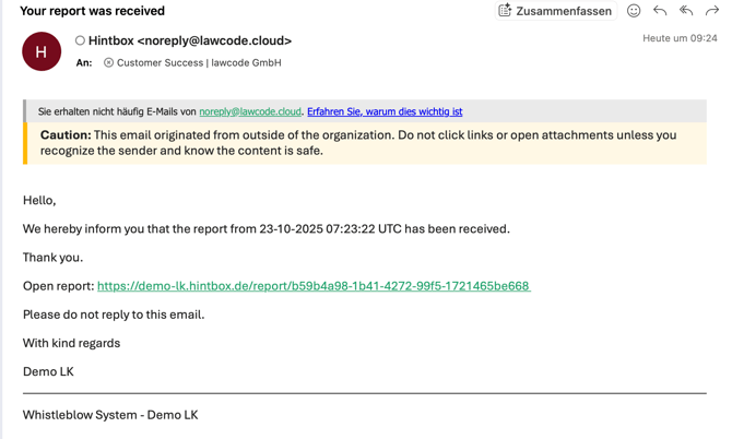 This message is automatically sent to the whistleblower as soon as a report is sent via the optional e-mail interface. The trigger is when an e-mail is sent to the interface.