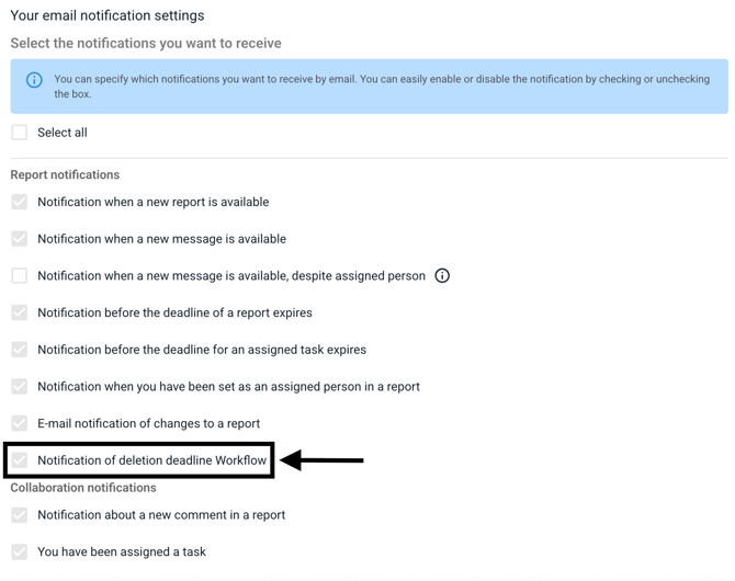 - The notification “Notification before the deadline of a report expires” must be activated in the user profile