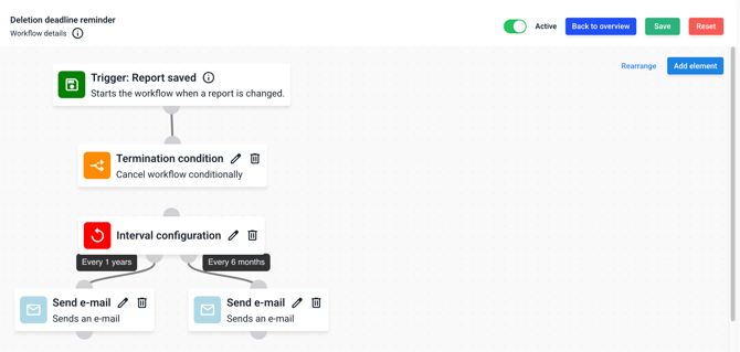 The Notification about deletion deadline template is automatically sent to all internal editors as soon as either a reminder is activated in the workflow or the “Notification of deletion deadline workflow” is activated within the user profile.