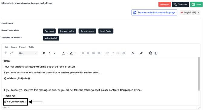 Whenever an email address is entered within the hintbox, this email template is automatically triggered for a confirmation and an e-mail is sent to the e-mail address concerned.
