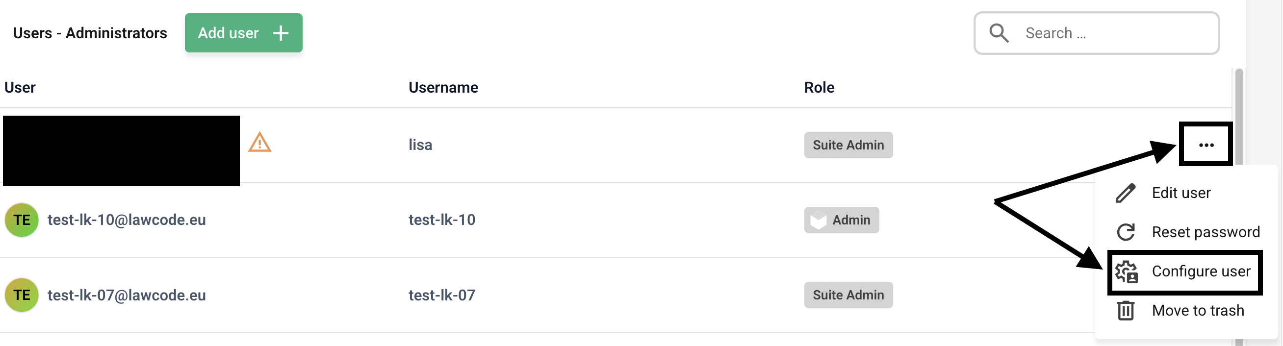 You can tell that a user does not have full access if an orange triangle appears in the user's line. Now click on the cogwheel.