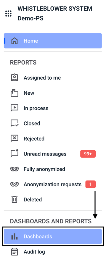 Clicking on Dashboards opens the possibility to graphically evaluate the number and type of reports.