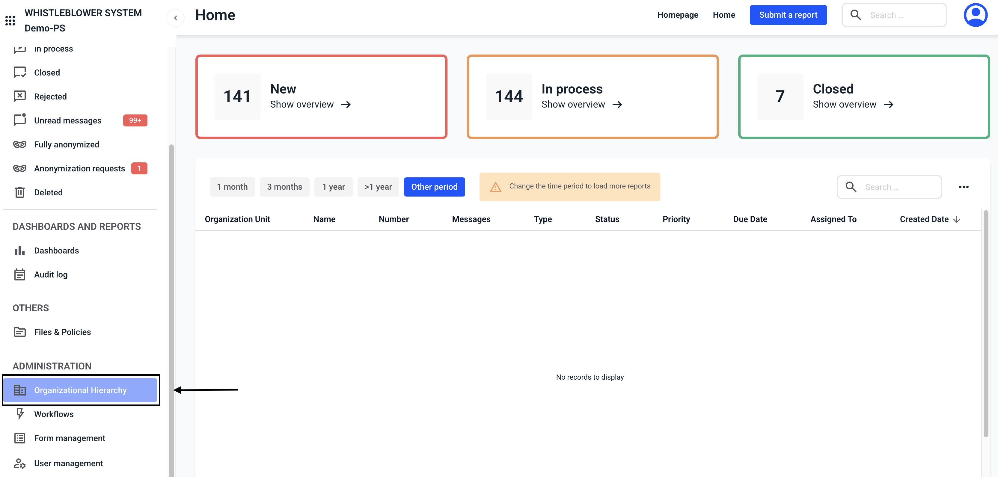 In the Organizational hierarchy section, you can create new subsidiaries, edit existing subsidiaries, or delete subsidiaries.