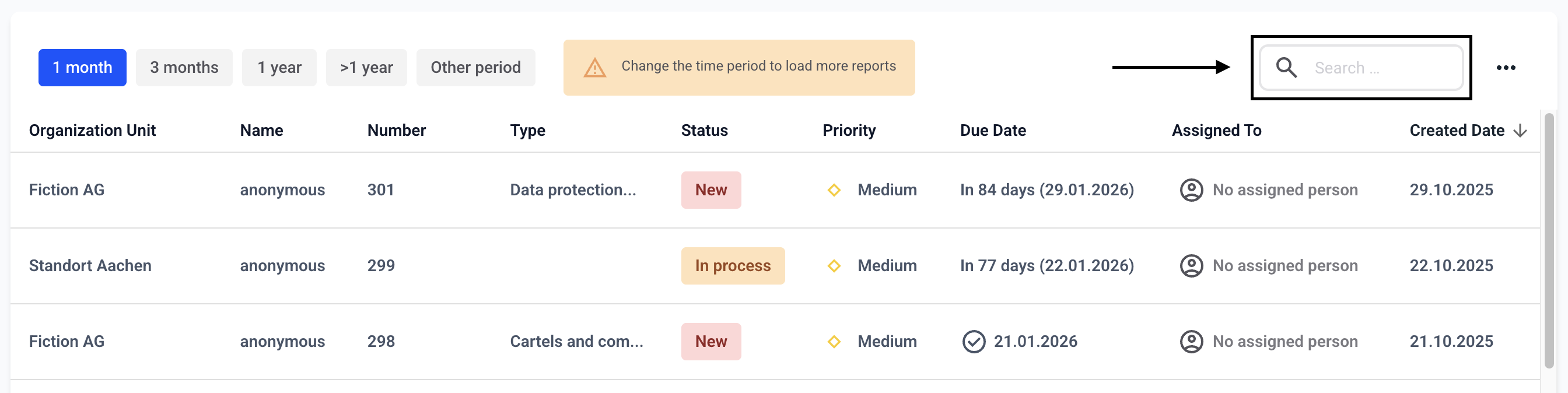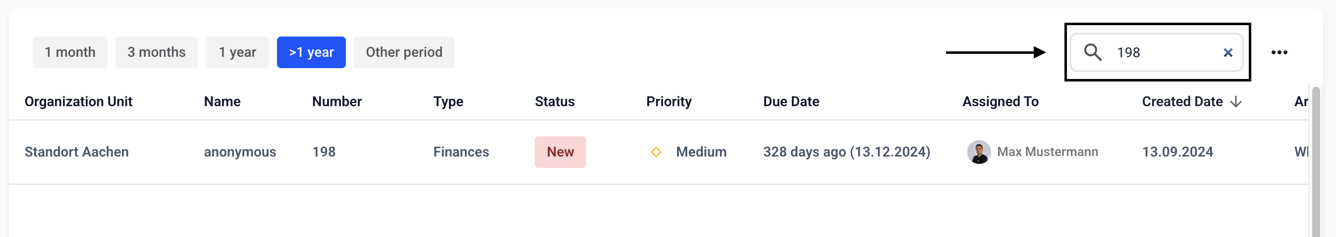 You can use the search field to search for a specific note in the hint box. The search field is located right next to the time filters, where you can enter the case number or other values from the columns to search for a specific note.