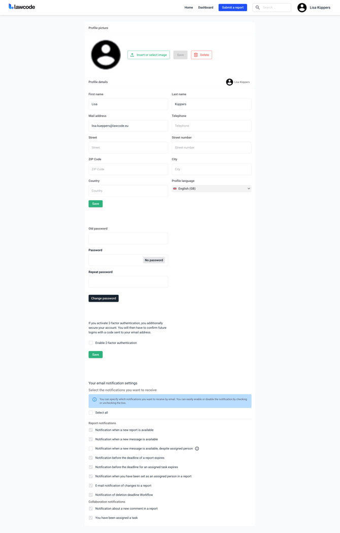 On the start page of your Hintbox, the Dashboard, you will find the black profile icon on the upper right side. Via this icon you can change and customize your own user profile.