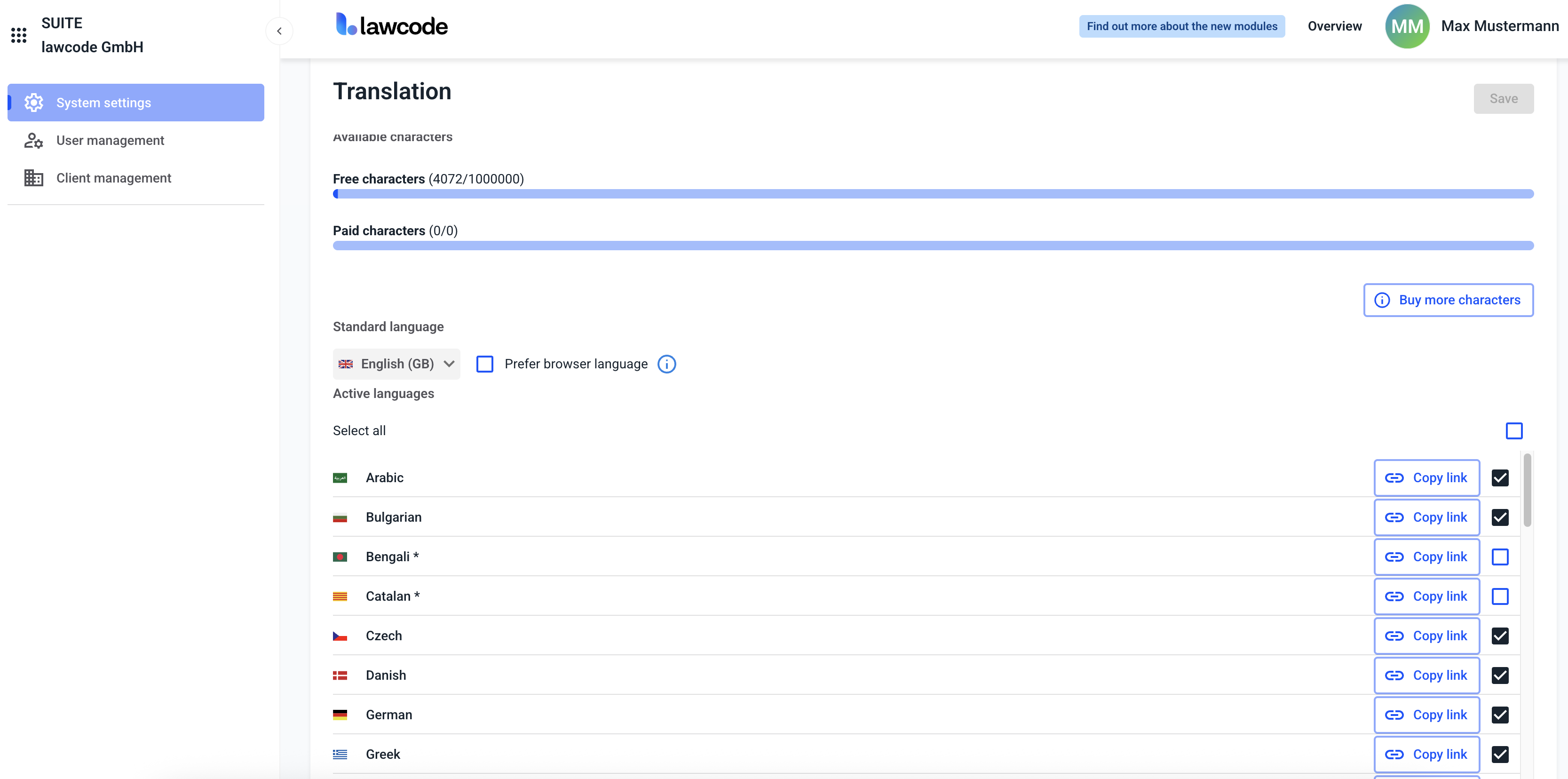 Free characters - The Suite is supplied with 1,000,000 translation characters as standard. This quota is available to you annually. The legal texts, e-mail texts, messages to and from the whistleblower, suppliers or external persons, categories and processes, as well as steps and fields in the dynamic form can be translated from the quota. If all characters have been used up, more characters can be purchased. To do this, please call the hotline or contact our support team by e-mail. You will also receive this information when you click on Buy more characters.