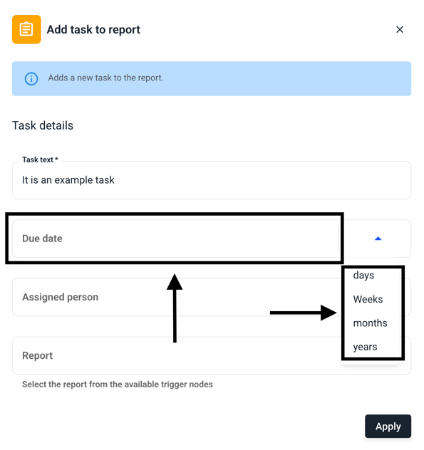 Select a due date in the future. You can choose between days, weeks, months, or years.