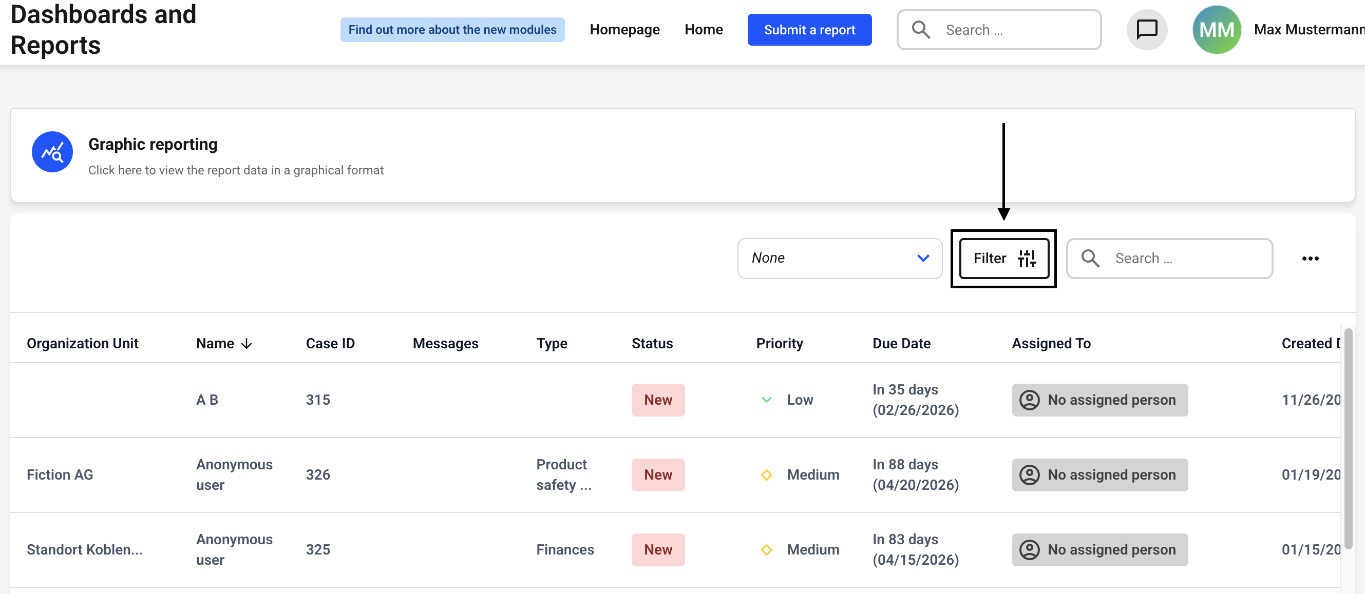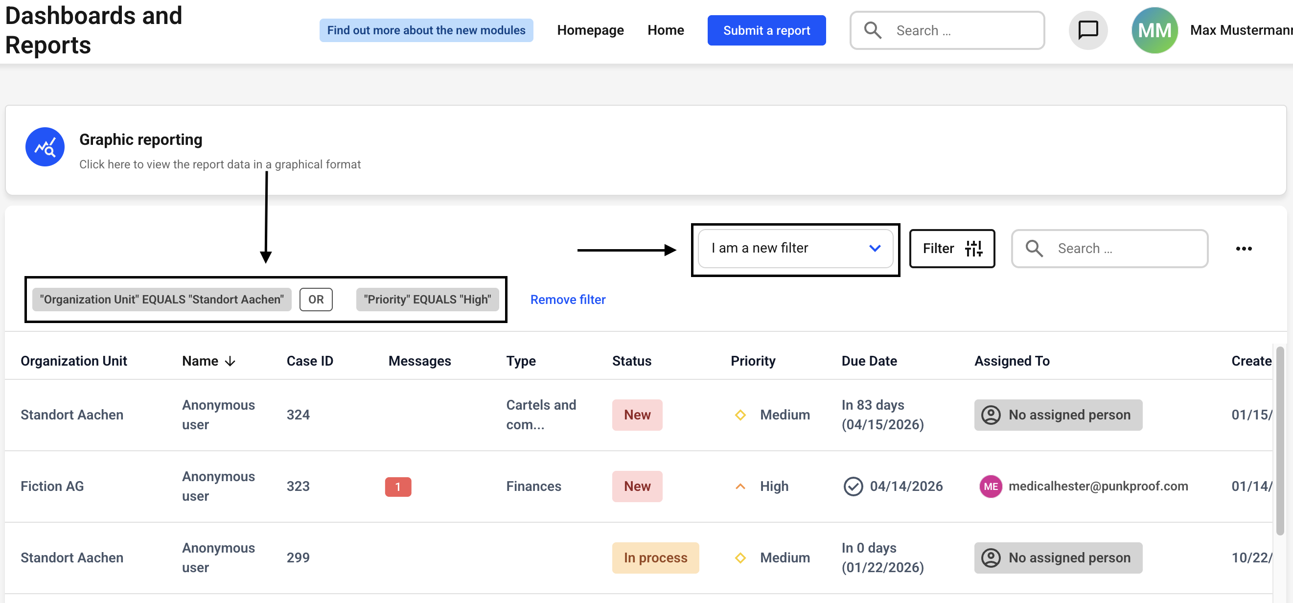 The graphic reporting above the filters is always based on the currently set filters. All diagrams only show the results that the set filters have produced.