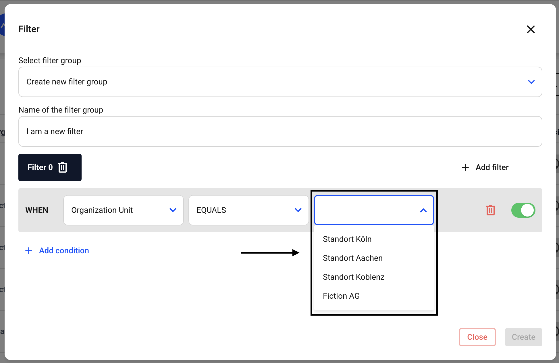 You can now add conditions to Filter 0 or Filter 1. By clicking on the filter, you can decide which filter you want to add conditions to. Everything you add as a condition within the filter is seen by the hint box as an AND filter. If you add a condition to Filter 1 and also to Filter 0, it is considered an OR filter.