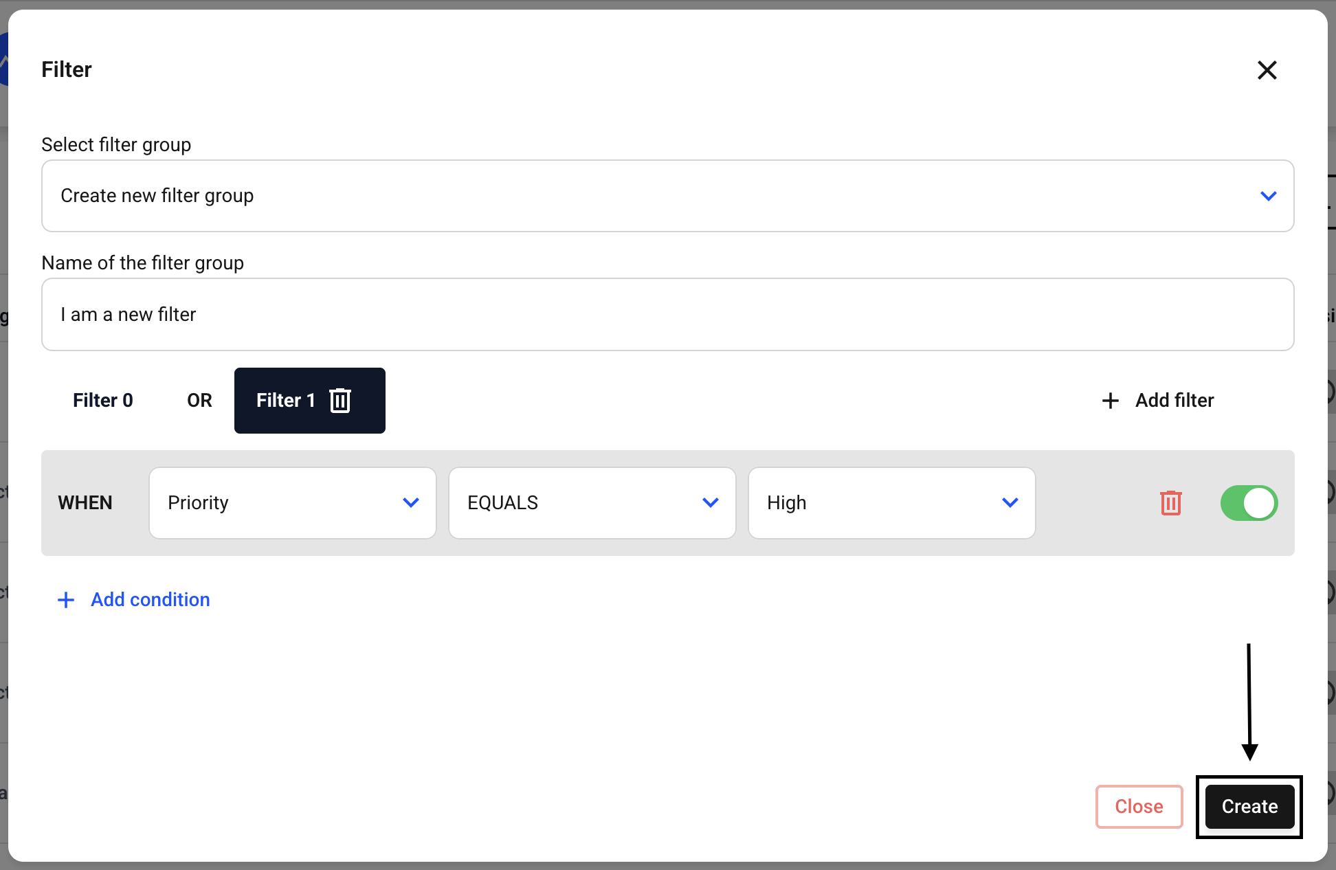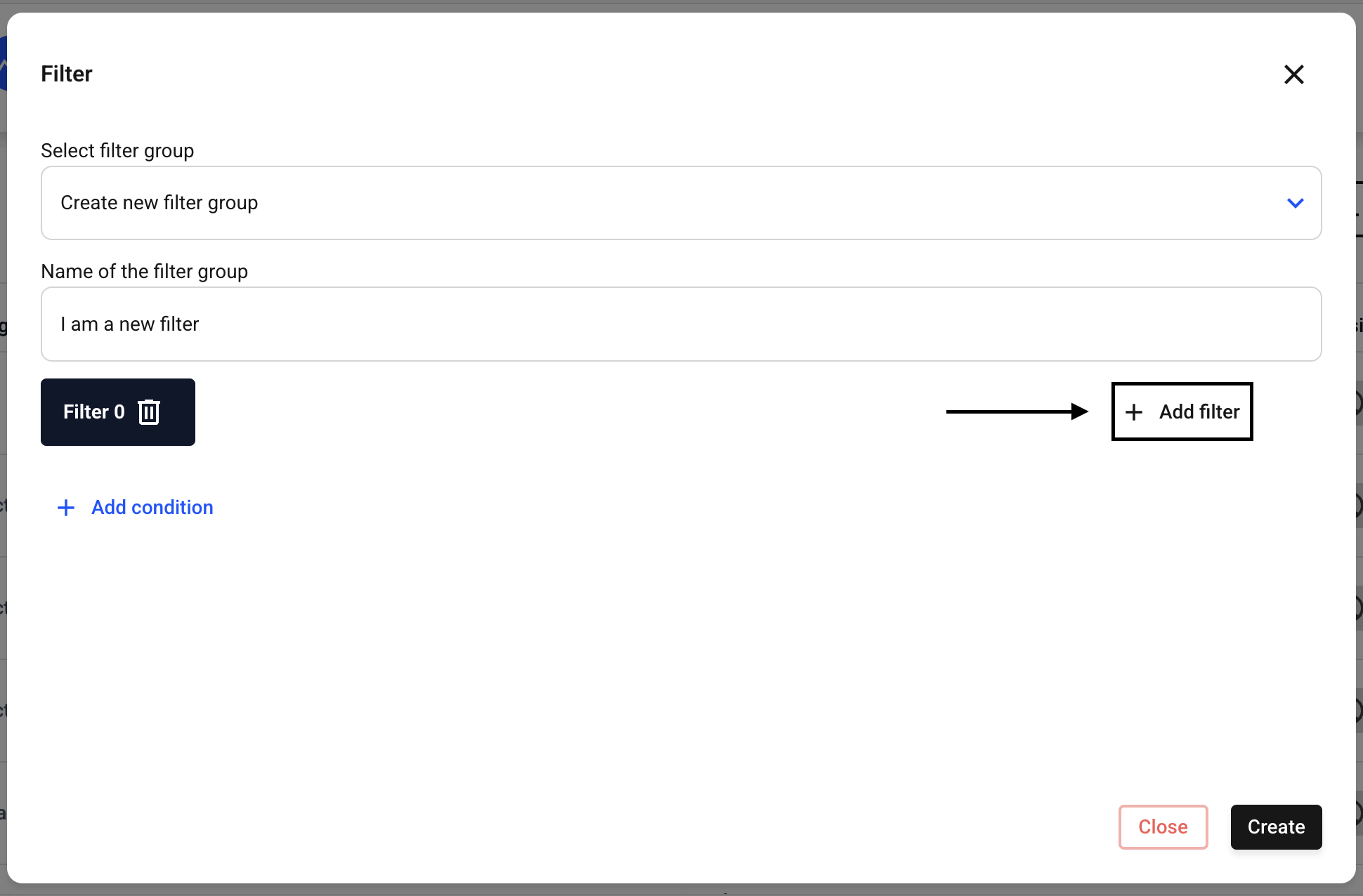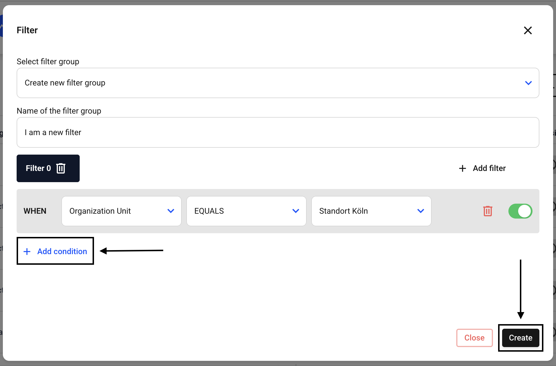 You have now saved a condition. For each additional condition you save, an AND will be displayed at the beginning of the line. You can now create this filter, or you can filter for additional AND conditions.