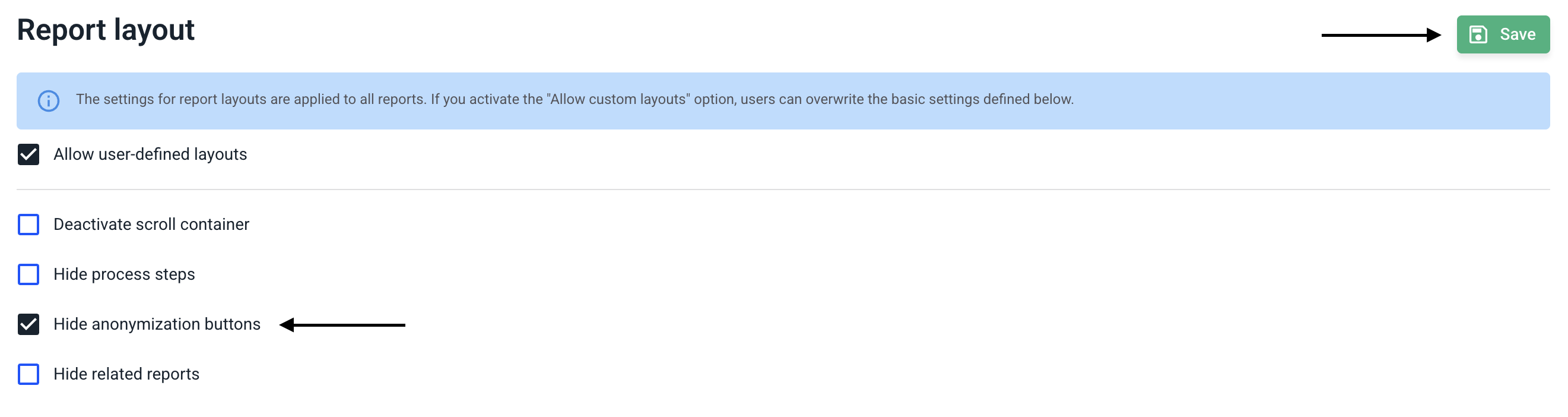 To permanently disable the anonymization buttons, check the box next to hide anonymization buttons. The anonymization buttons are enabled by default. Then click Save to apply the changes.