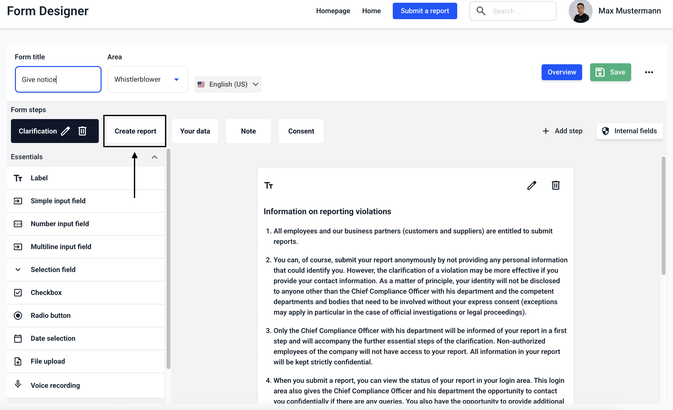 It is possible to allow whistleblowers to distort their voice recordings. To do this, first navigate to the Form management section.