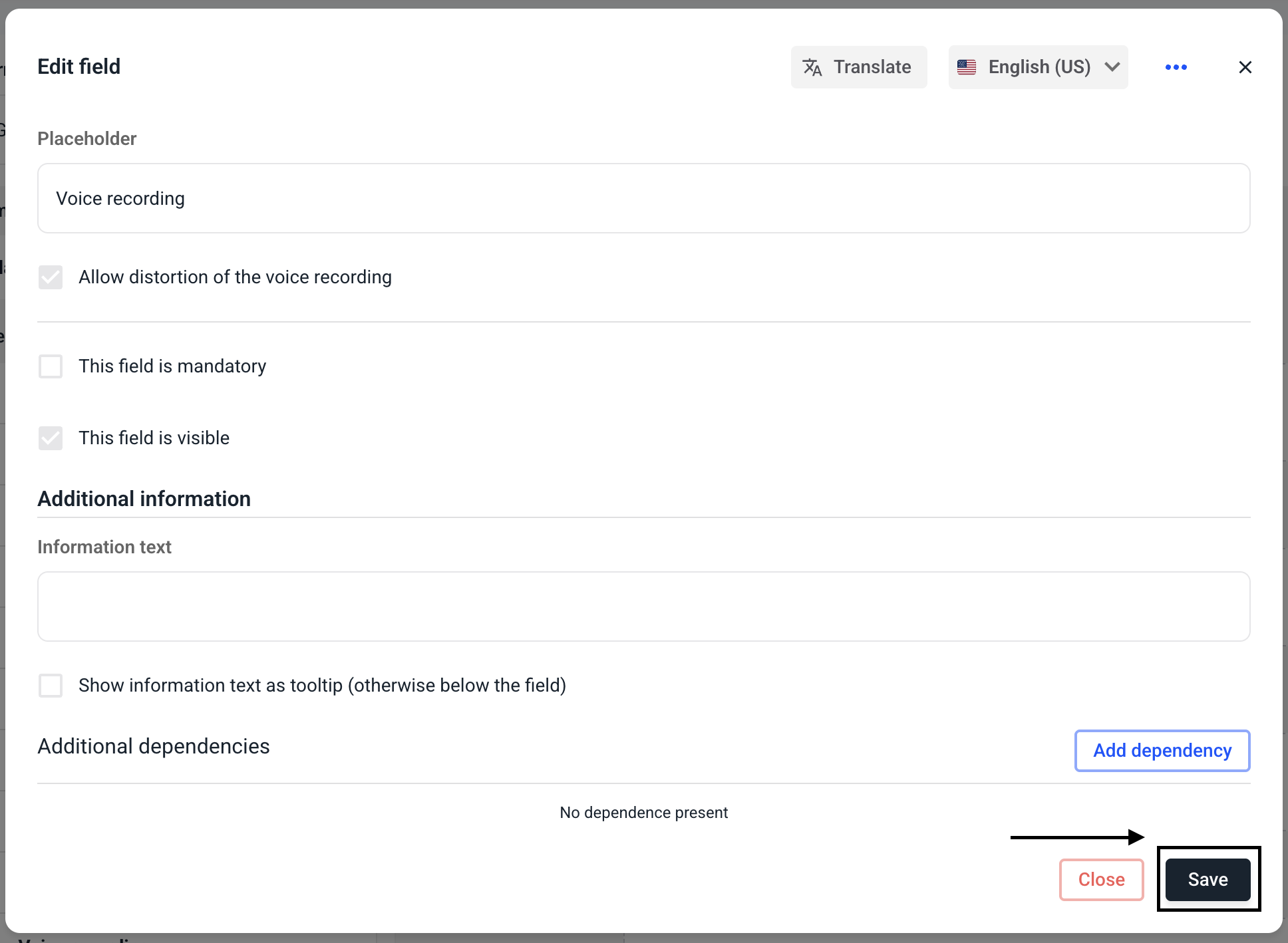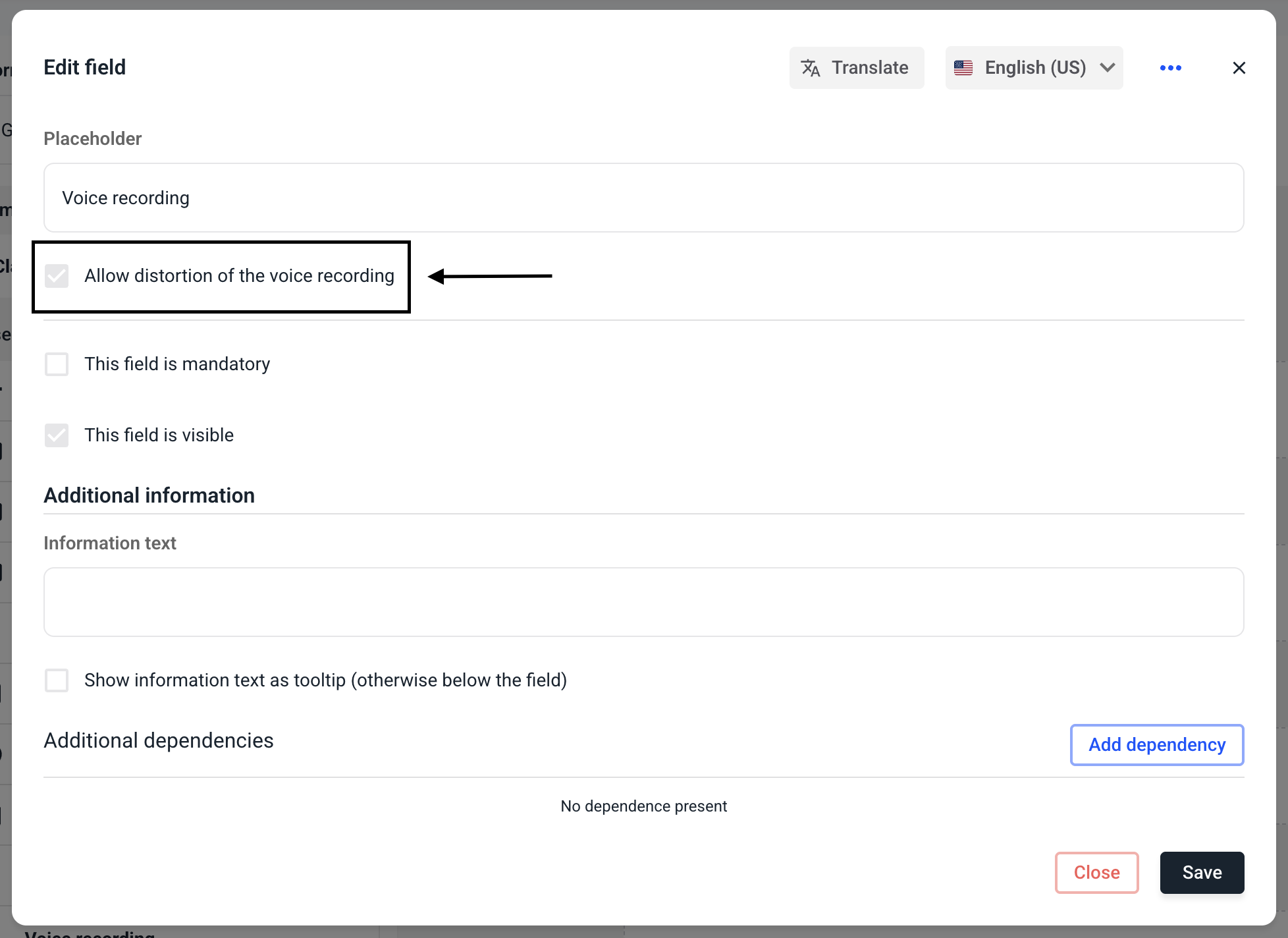 Select the Allow distortion of the voice recording checkbox.
