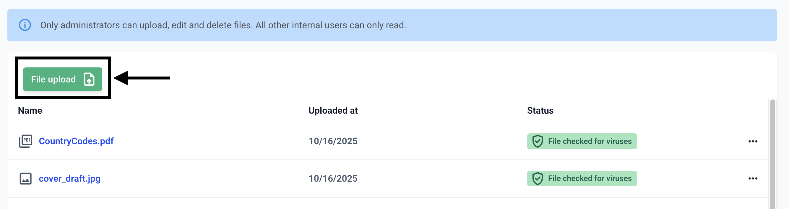 This chapter describes how to upload a file in the Files & Policies area.