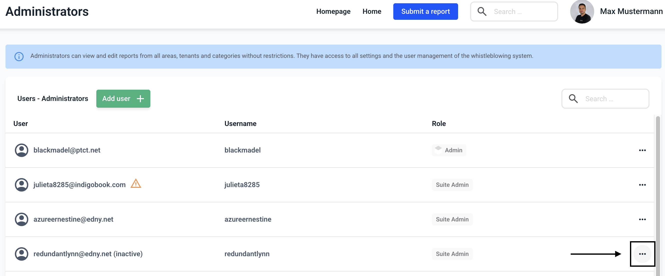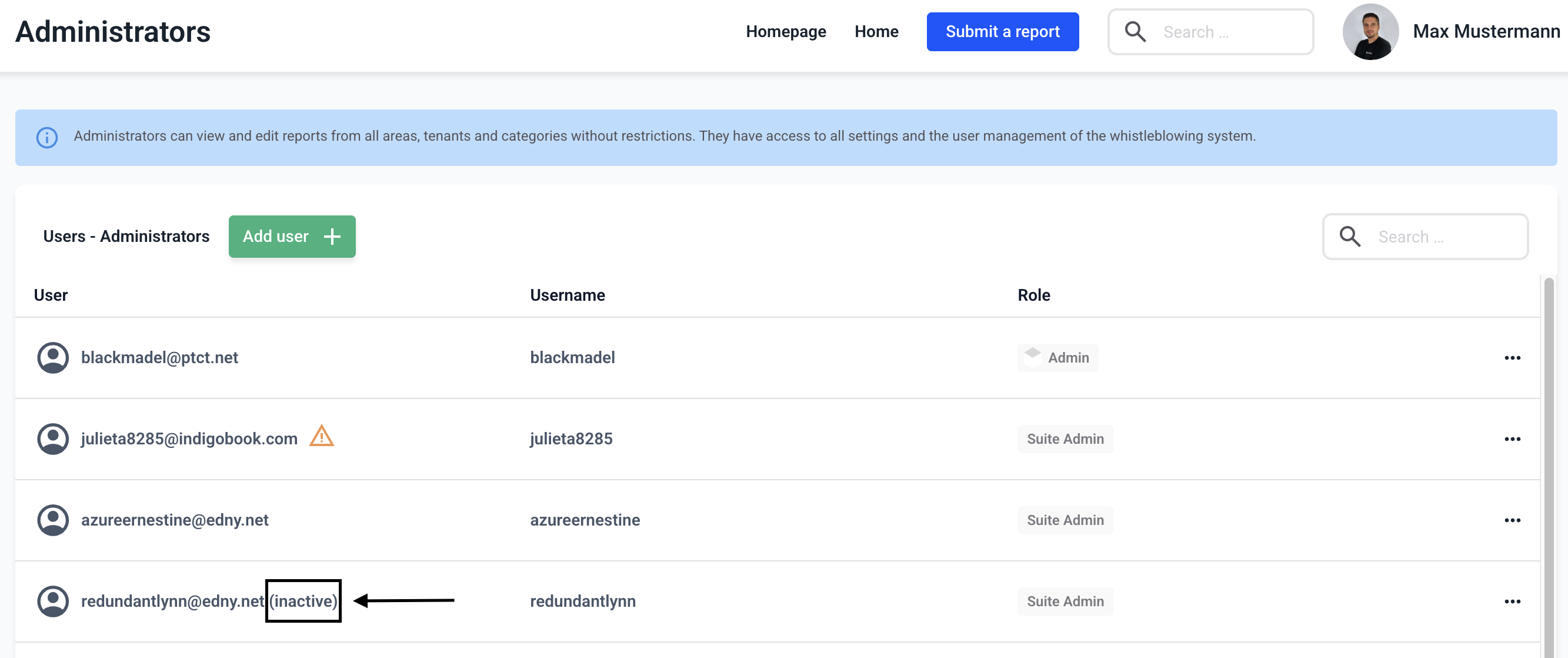 You will now see an overview of all administrators stored in the system. You can recognize inactive users immediately by the word (inactive) next to their user names.