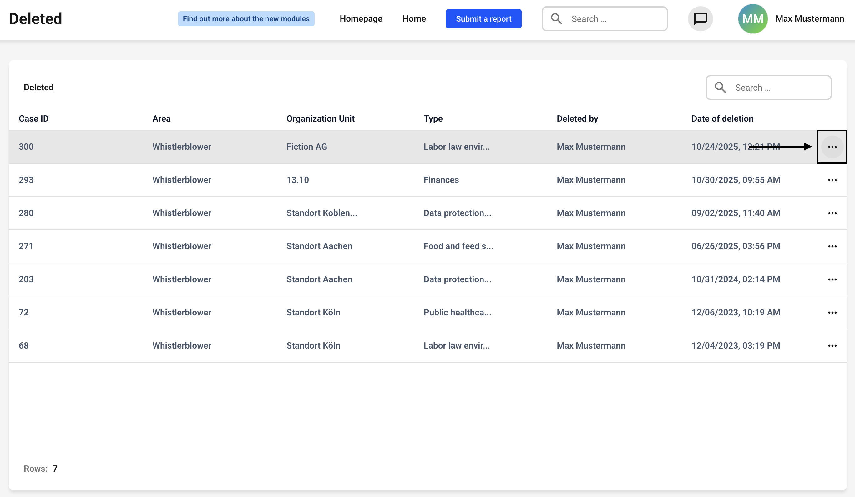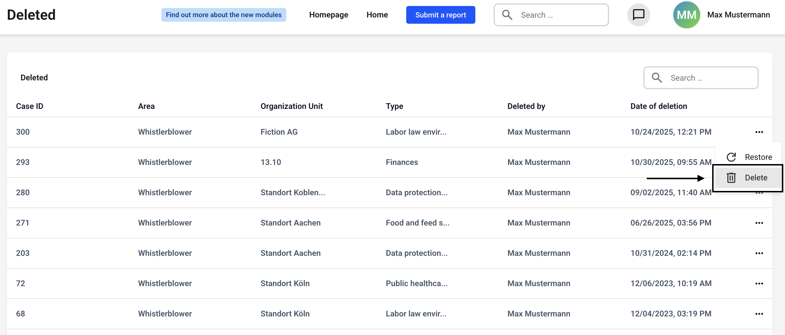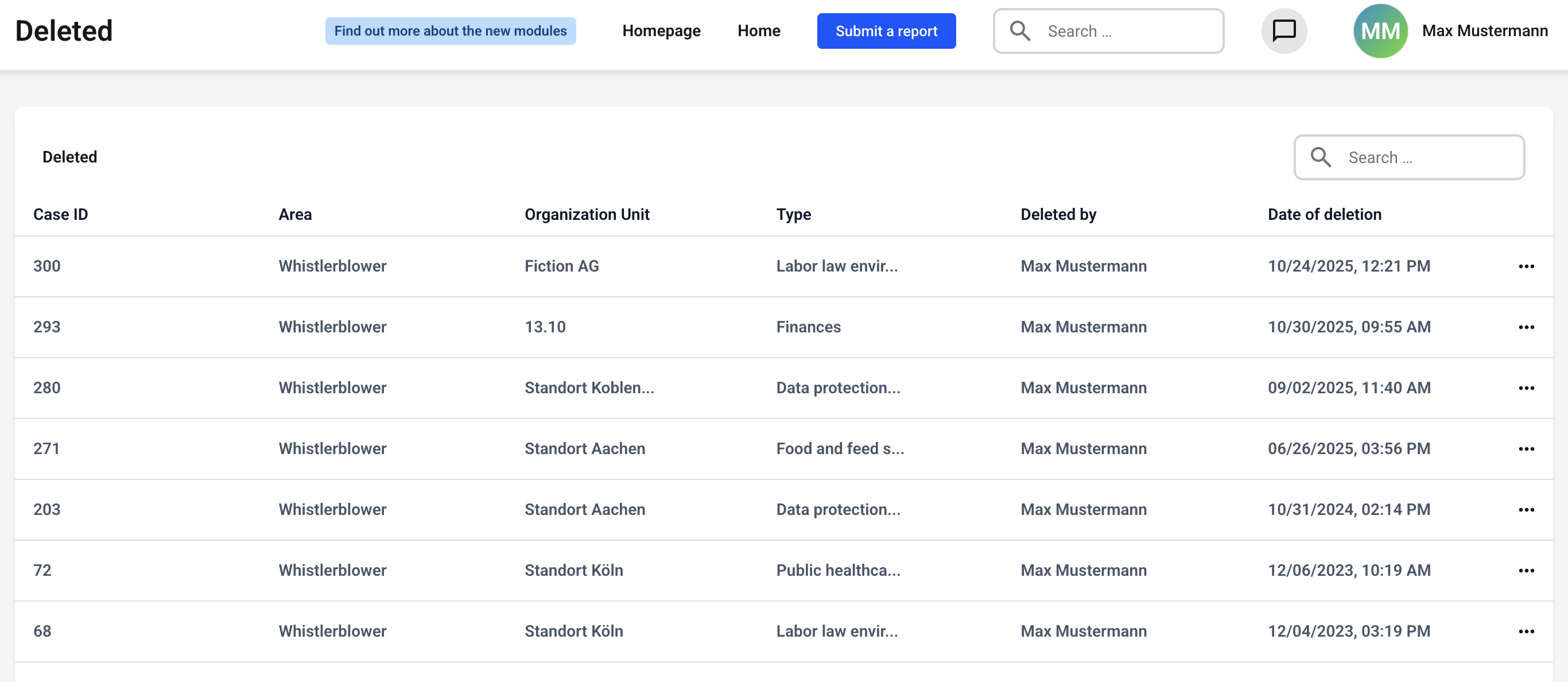 You will receive a detailed overview of the reports that have been moved to the trash.