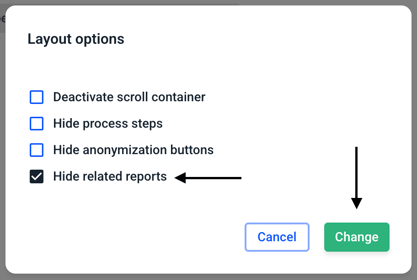 If you want to hide the related reports, check the box next to hide related reports. If you want to show the related reports, uncheck the box. Then confirm your selection by clicking Change.