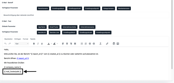Zum Beispiel kann hier das vorangegangene Beispiel verwendet werden. Die Benachrichtigung über die Löschfrist. Es ist ersichtlich, dass der Emailfooter ein Teil einer anderen Schablone ist. Der im Email Footer eingetragene Text wird automatisch ergänzt.