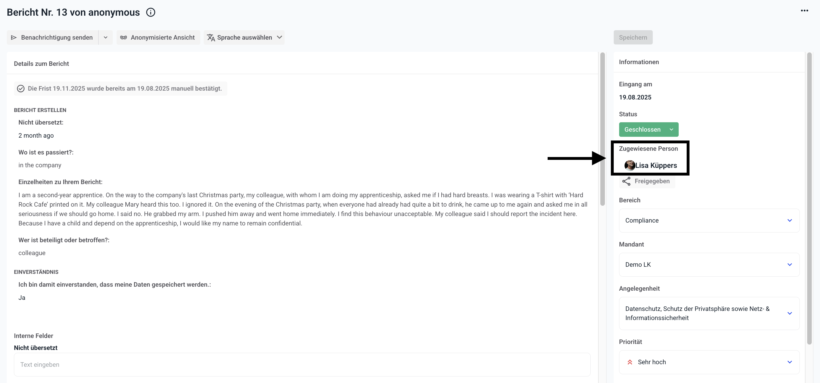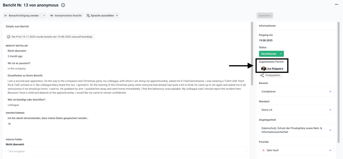 Sobald eine neue zugewiesene Person innerhalb eines Hinweises festgelegt wird, wird diese Person in dem Moment der Zuweisung automatisch per E-Mail informiert.