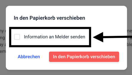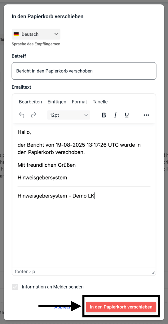 Sie können innerhalb eines Hinweises einen Bericht in den Papierkorb verschieben. Die Schablone wird nur ausgeführt, wenn Sie sich entscheiden dem Hinweisgeber eine Information zu der Löschung zu senden.