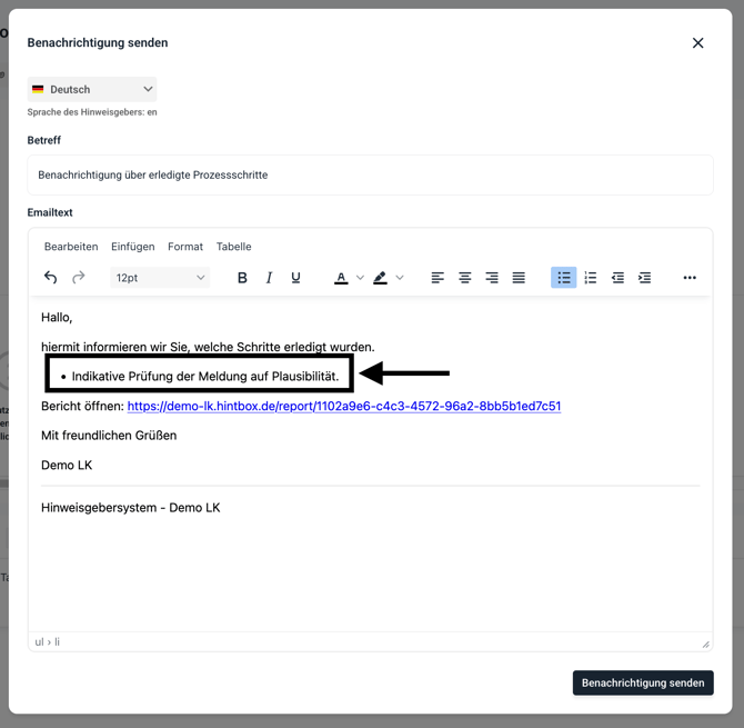 In beiden Fällen wird diese Vorlage für den Hinweisgeber verwendet. Wenn Sie den Bericht benutzerdefiniert benachrichtigen möchten, können Sie die Vorlage noch einmal für diesen Hinweis umändern oder ergänzen.