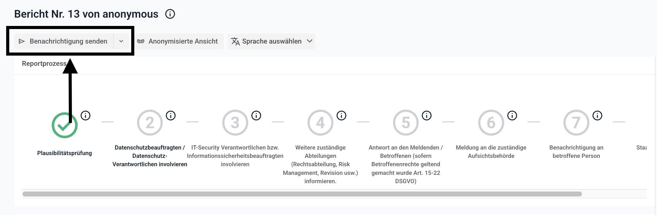 Immer wenn ein Hinweisgeber, oder auch ein interner Bearbeiter innerhalb eines Berichtes auf "Bericht senden" drücken, wird die Schablone ausgelöst.