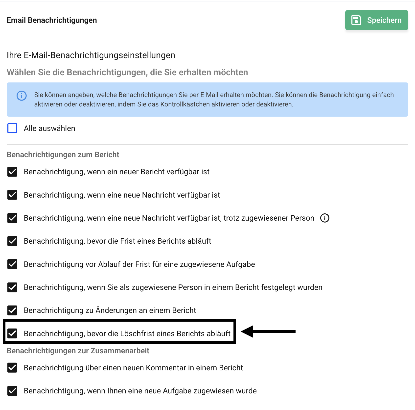 - Die Benachrichtigung "Benachrichtigung, bevor die Frist eines Berichts abläuft" muss in dem Benutzerprofil eingeschaltet sein