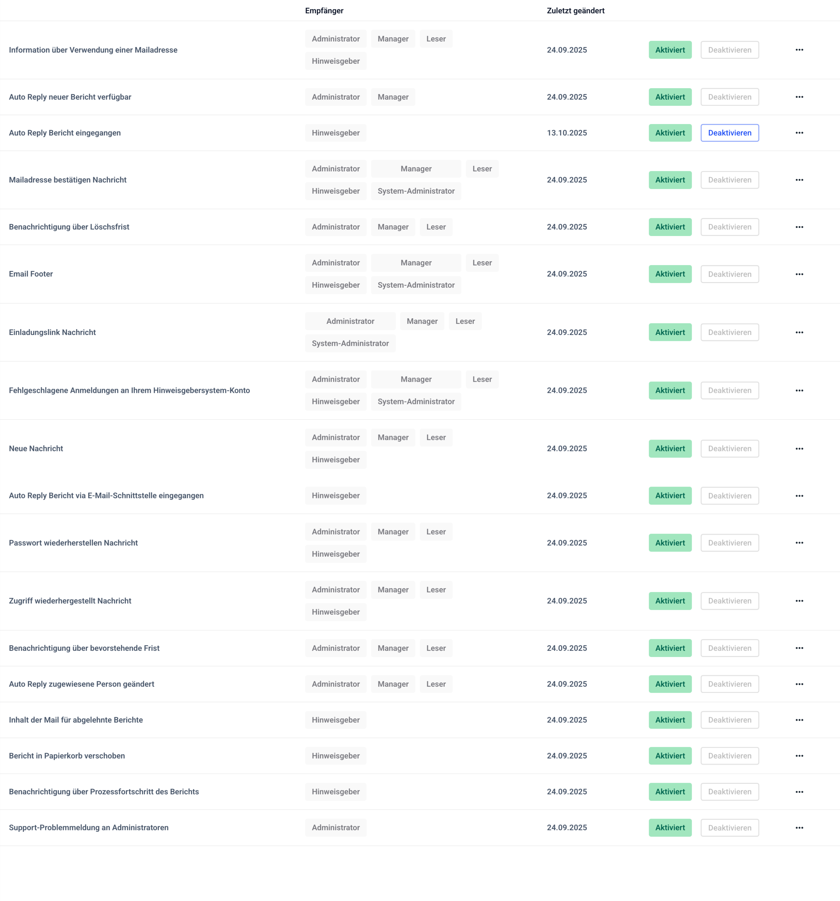 Innerhalb der Hintbox befinden sich 18 E-Mailvorlagen, die teilweise automatisch bzw. halbautomatisch ausgelöst werden. Neben jeder Schablone ist aufgeführt, an welche Benutzerrollen diese E-Mails versendet werden können.
