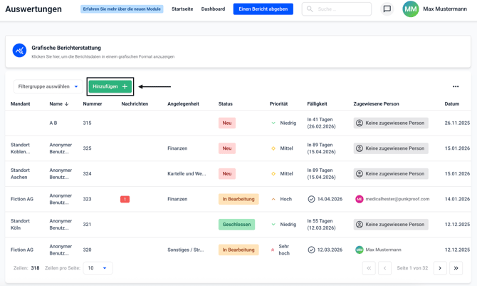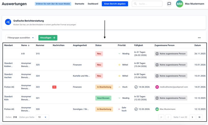 Bei einem Klick auf Grafische Auswertungen öffnet sich die Möglichkeit die Anzahl und Art der Berichte grafisch auszuwerten.