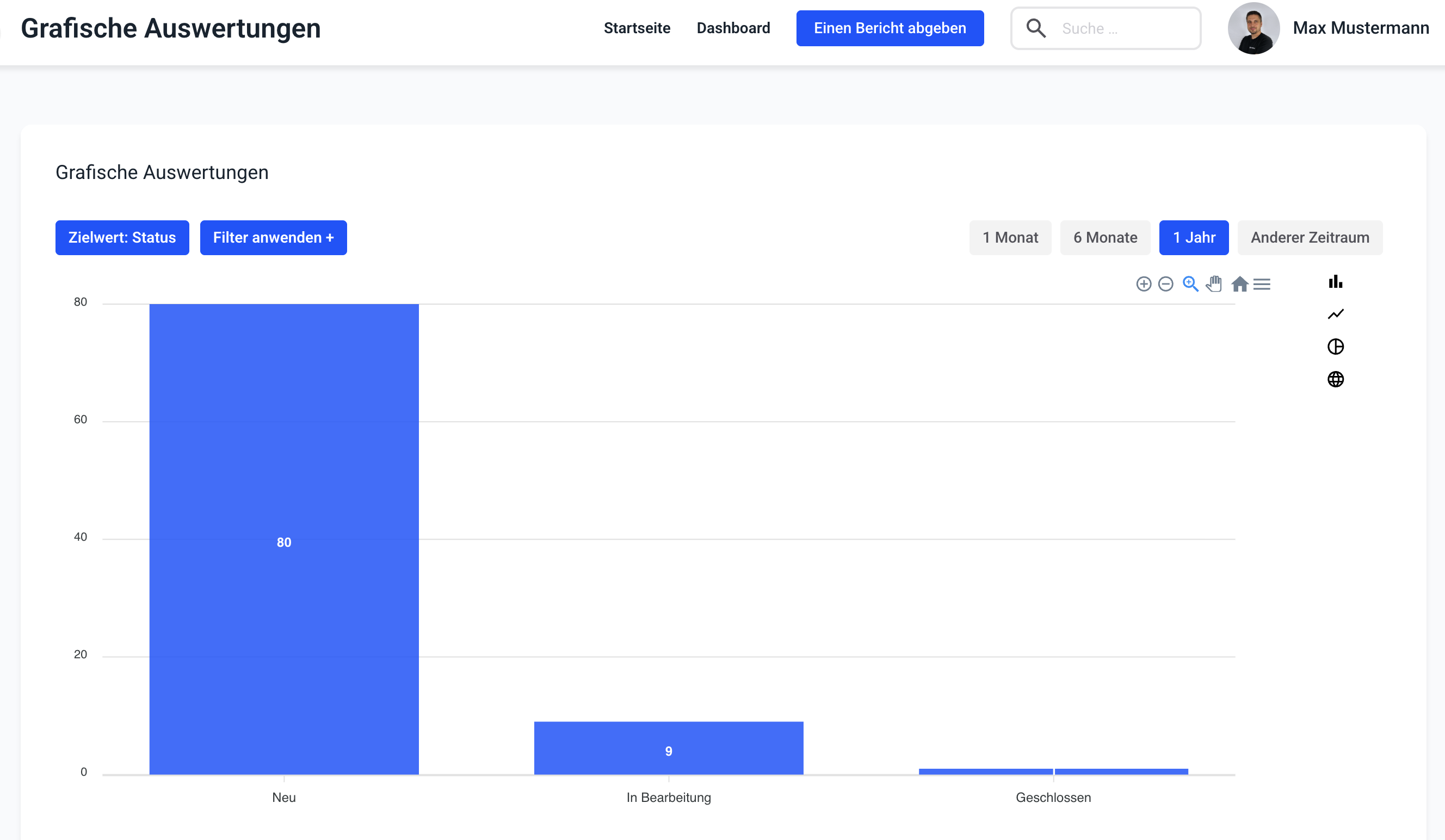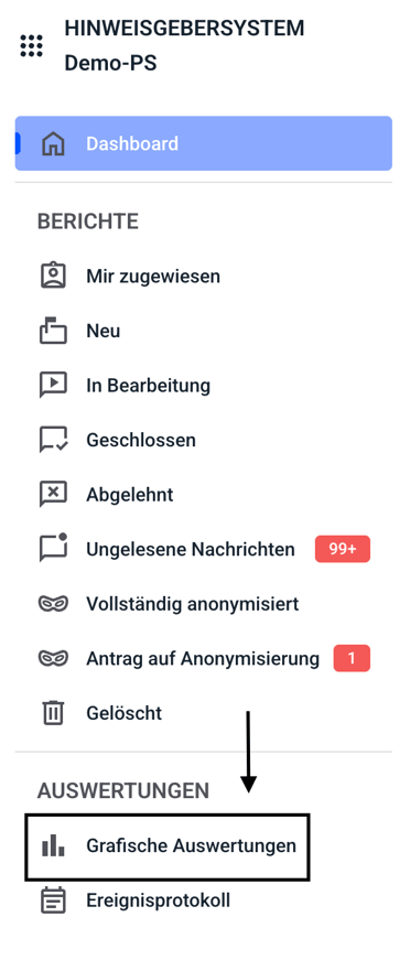 Bei Klick auf Grafische Auswertung öffnet sich die Möglichkeit die Anzahl und Art der Berichte grafisch auszuwerten.