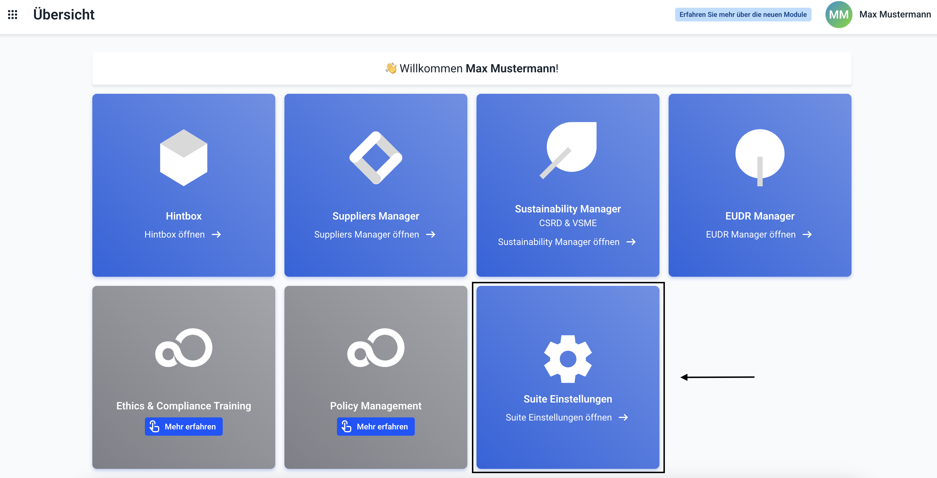 Um die Suite Systemeinstellungen zu öffnen, klicken Sie in der Suite Übersicht auf die Suite Einstellungen.