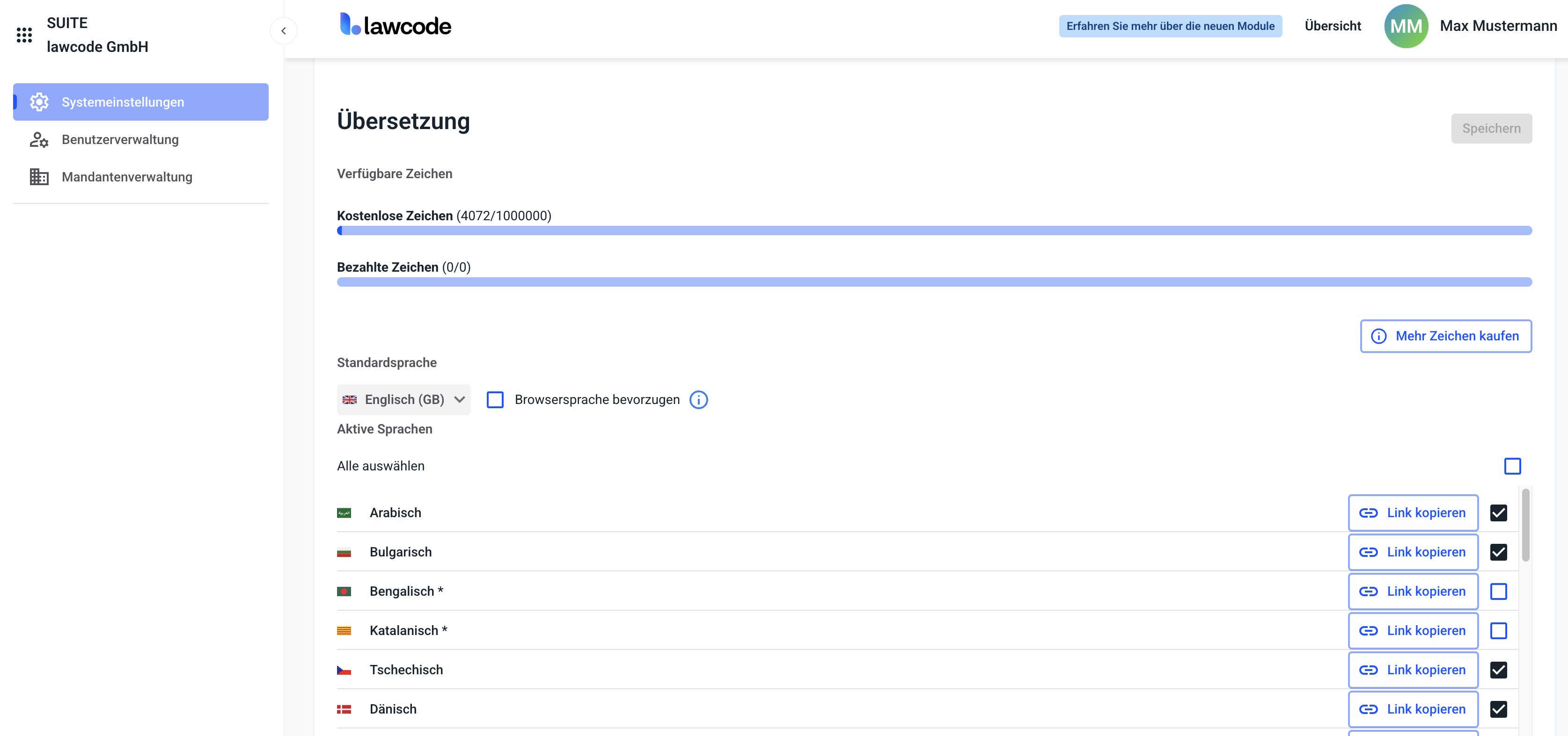 Aktive Sprachen - Die Suite kann von allen Personen in allen ausgewählten Sprachen genutzt werden.