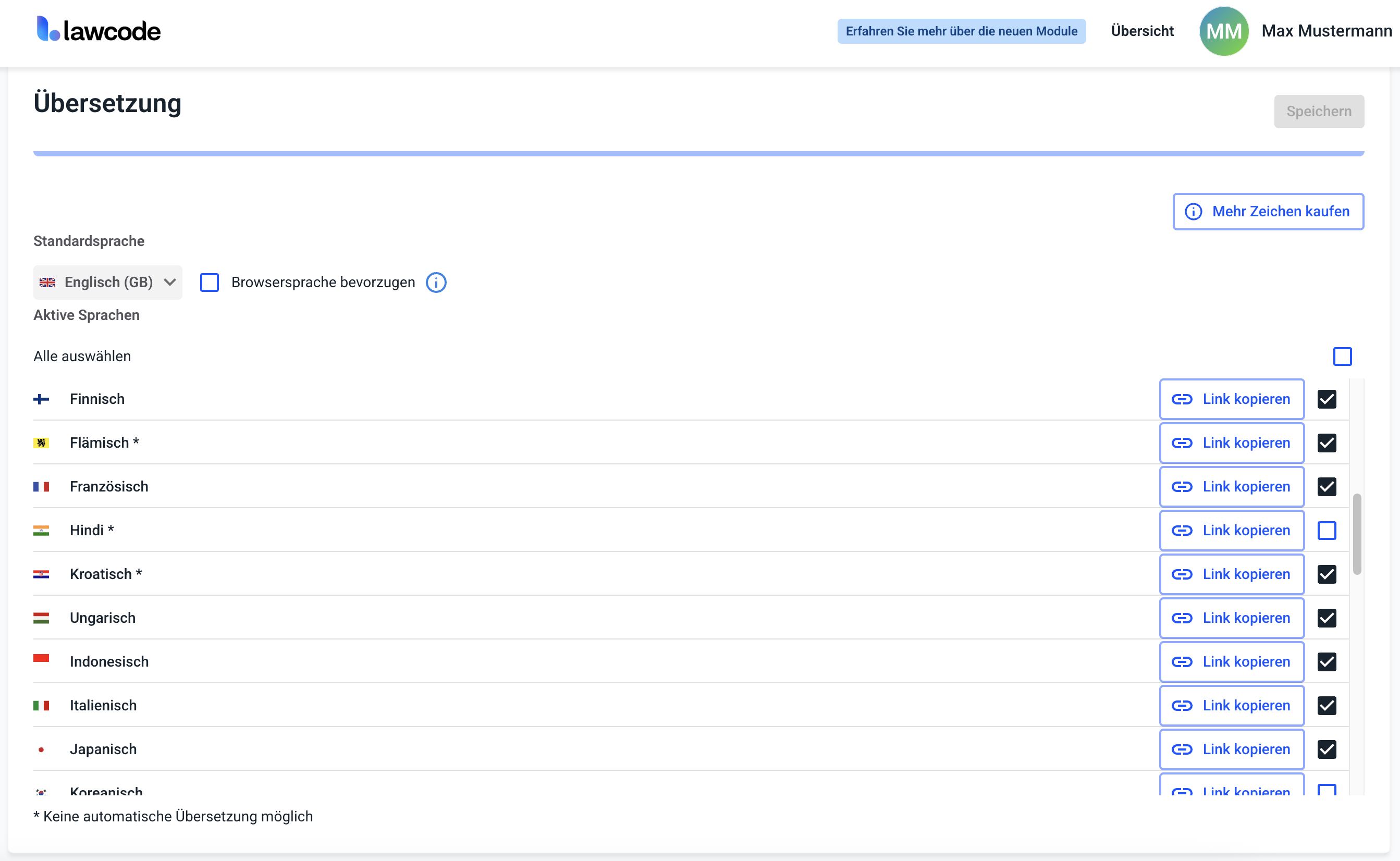 Bei den Sprachen, die mit einem * hinterlegt sind, ist keine automatische Übersetzung möglich. Die Inhalte der Sprachen müssen manuell übersetzt werden.