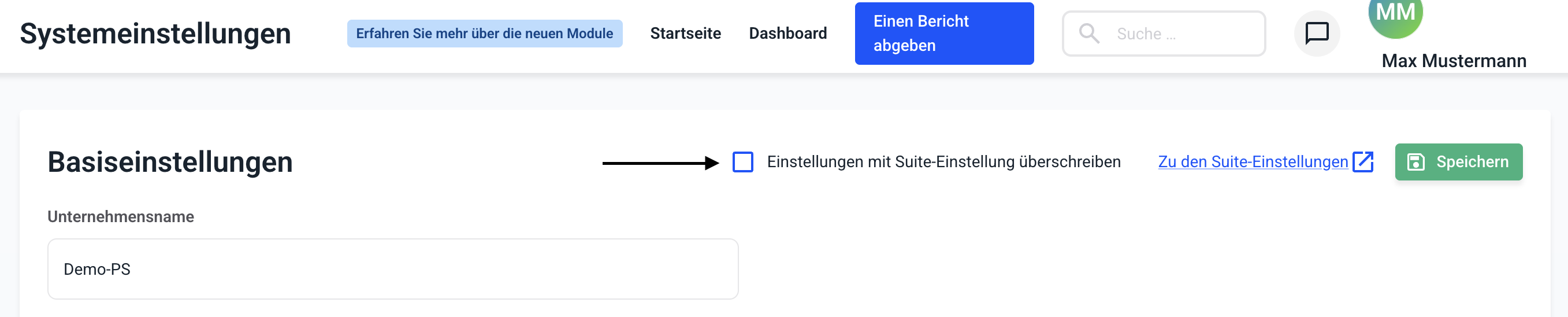 Bitte beachten Sie, dass die Systemeinstellungen in der Suite auf alle Module übertragen werden können. In den Systemeinstellungen der verschiedenen Module kann darauf ausgewählt werden, ob die Suite Systemeinstellungen übernommen werden sollen oder ob eine individuelle Anpassung für das bestimmte Modul vorgenommen werden soll.