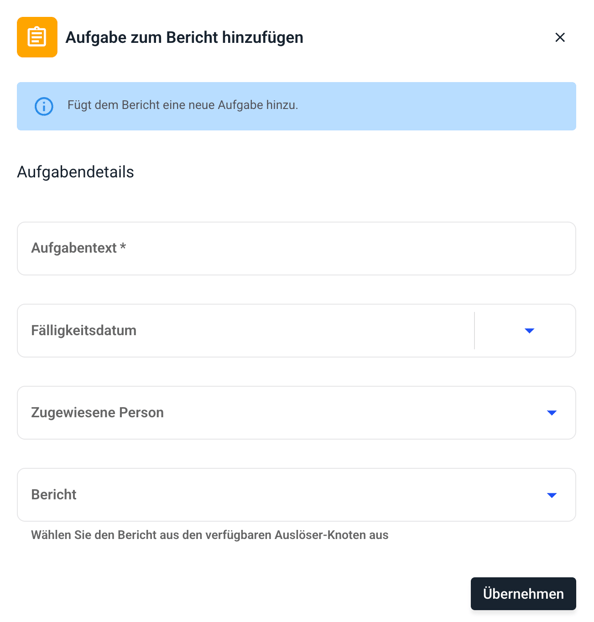 Innerhalb des Aufgabe zum Bericht hinzufügen starten Sie mit den nachfolgenden Optionen.