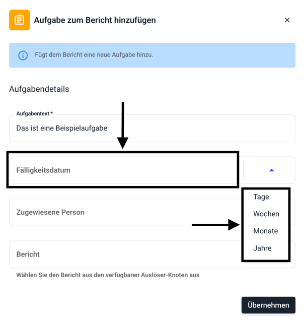 Wählen Sie ein Fälligkeitsdatum in der Zukunft. Sie können zwischen Tagen, Wochen, Monaten, Jahre wählen.