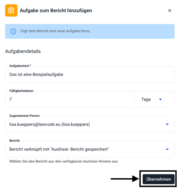 Wie bearbeite ich das Hinzufügen einer Aufgabe zum Bericht innerhalb des Workflows?