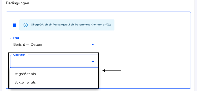 Als nächstes klicken Sie auf das Drop Down Menü des Operators. Der Operator bezieht sich immer auf das darüber gelegene Feld. Die Angaben passen sich aufgrund Ihrer vorherigen Auswahl automatisch an.