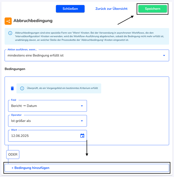 Sie haben jetzt die Möglichkeit die Änderungen der Abbruchbedingung zu speichern, oder Sie können eine weitere Bedingung anlegen.