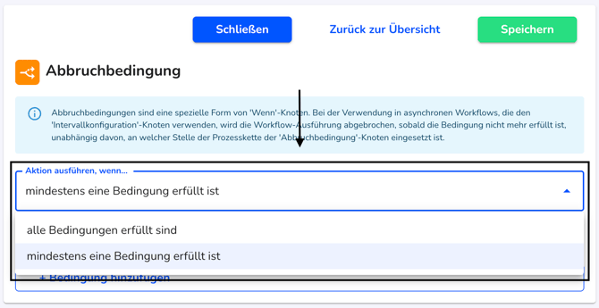 Geben Sie zunächst an, ob mindestens eine Bedingung oder alle Bedingungen für diese Abbruchbedingung greifen sollen.