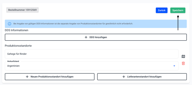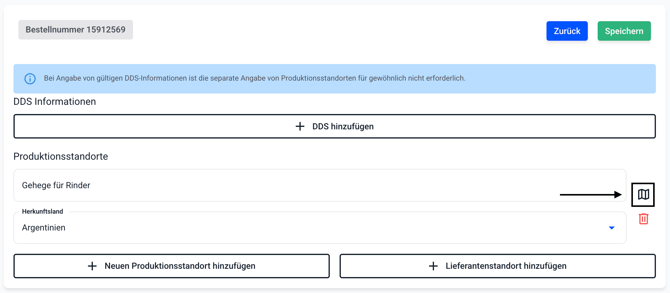 - Beim Anlegen eines neuen Produktionsstandorts geben Sie den Ort an, an dem das EUDR-relevante Produkt gewonnen oder produziert wurde
