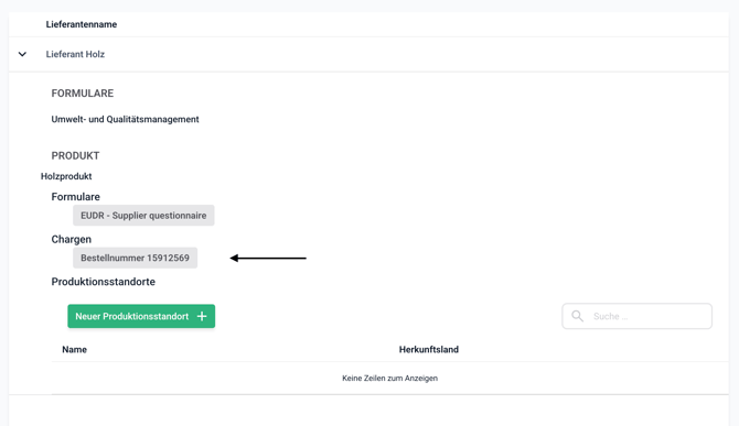 5. Klicken Sie auf die betroffene Charge (z.B. eine Lieferung oder Bestellung), für die Sie Angaben hinterlegen sollen.