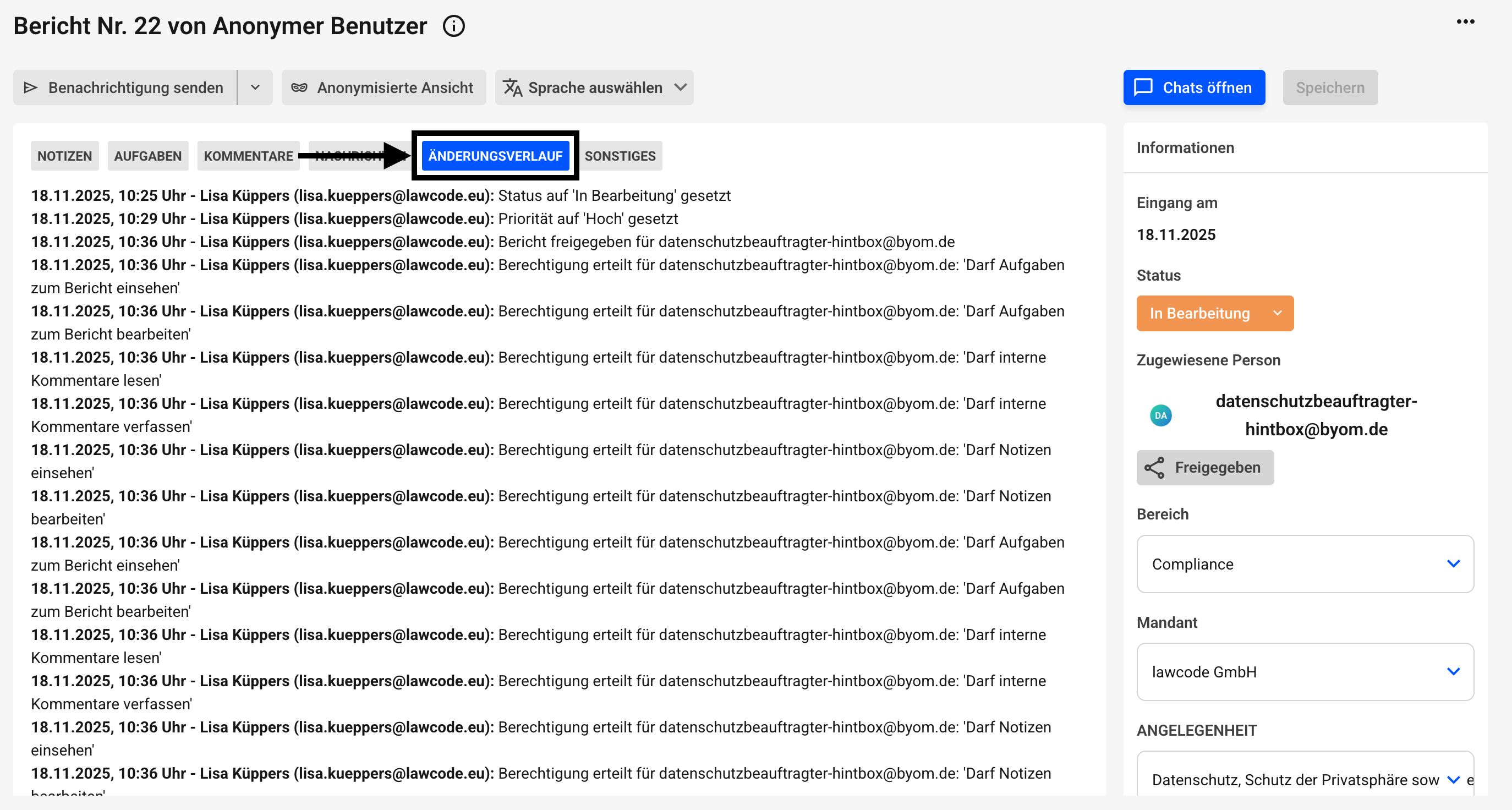 Sämtliche Änderungen und Anpassungen innerhalb eines Hinweises werden vom Änderungsverlauf getracked. Somit können Sie mit einem Klick auf “Änderungsverlauf“ alle durchgeführten Änderungen am Hinweis im Verlauf einsehen.