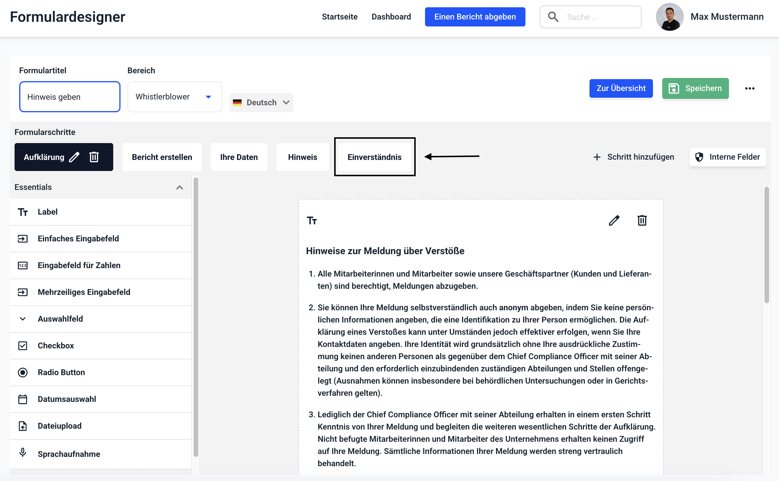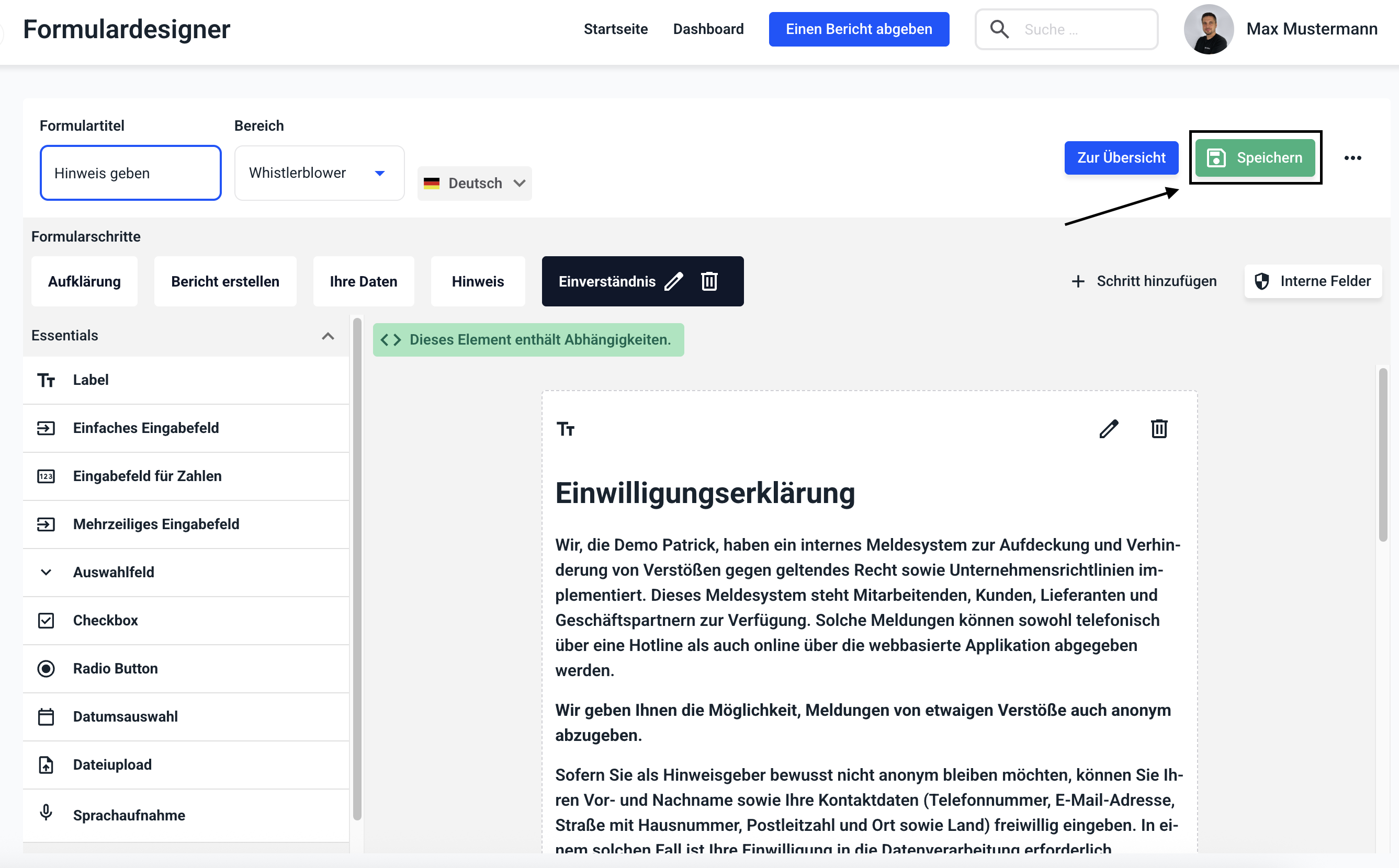 In diesem Beispiel erscheint die Einwilligungserklärung sobald der Hinweisgeber irgendetwas in das Feld Vorname einträgt. Dies können Sie für alle gewünschten Felder aus dem Kontaktformular (z.B. Nachname, E-Mail Adresse, ...) wiederholen. Anschließend klicken Sie auf Speichern.