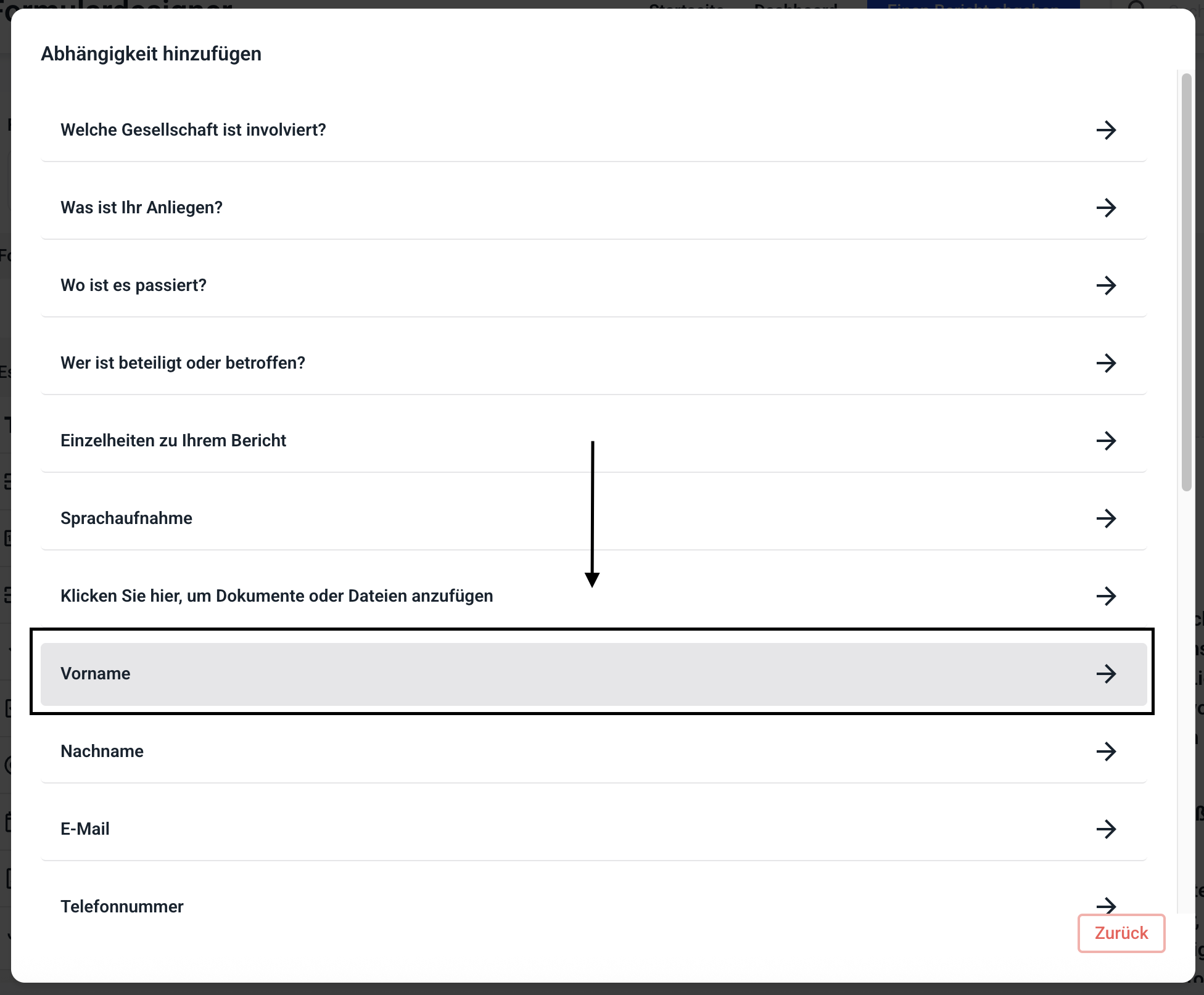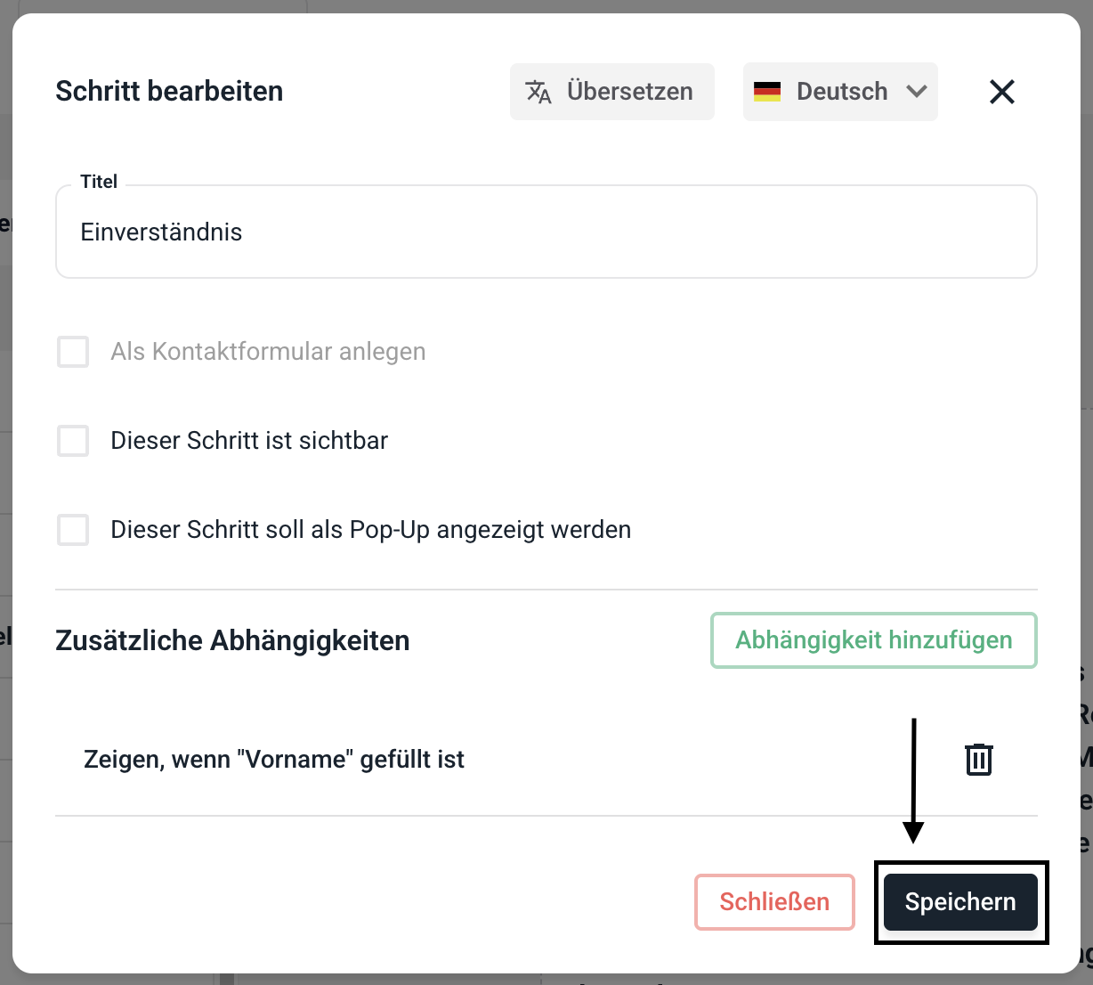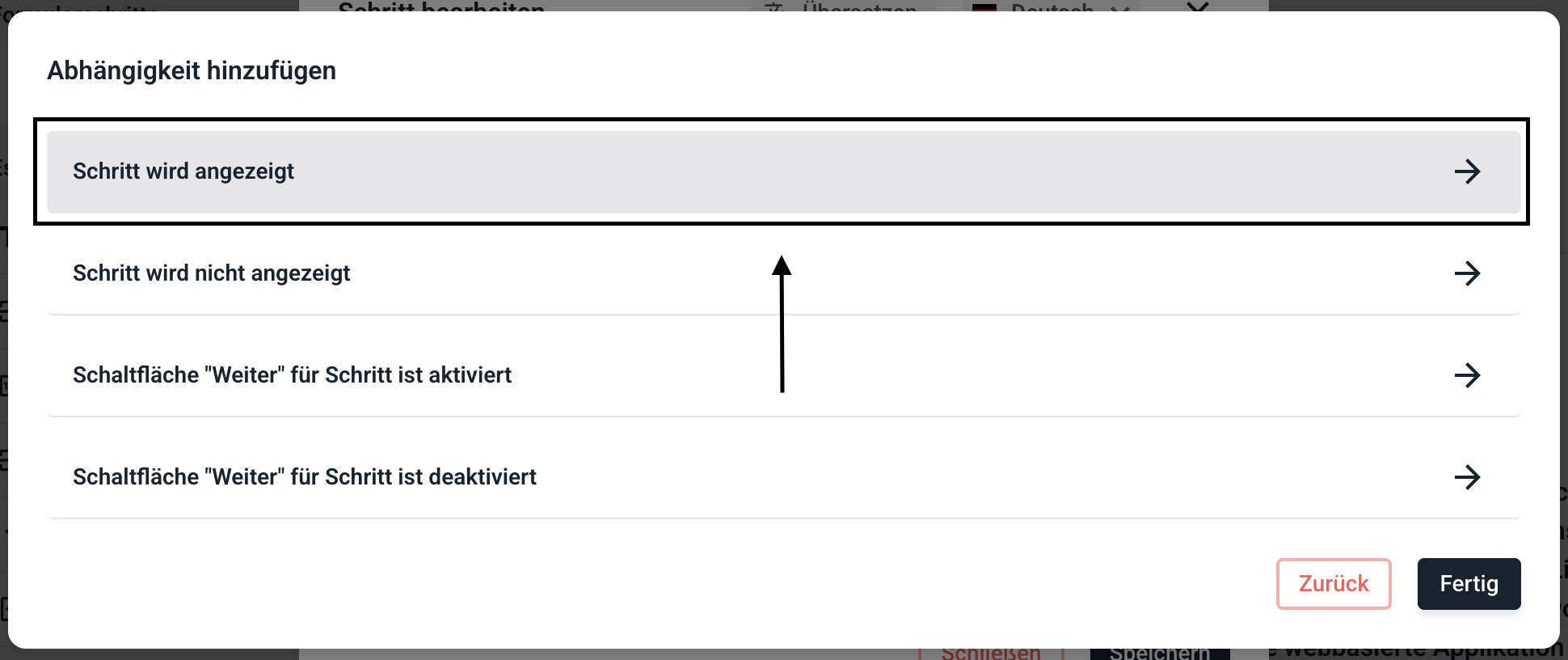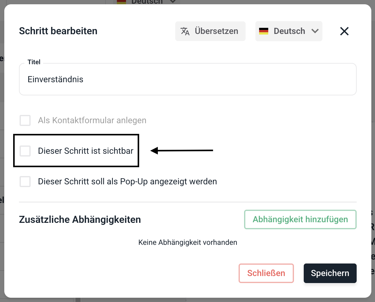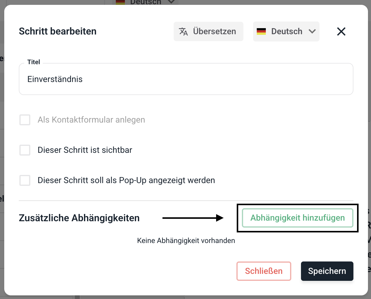 Um den Schritt für bestimmte Felder sichtbar zu machen klicken Sie auf Abhängigkeit hinzufügen.