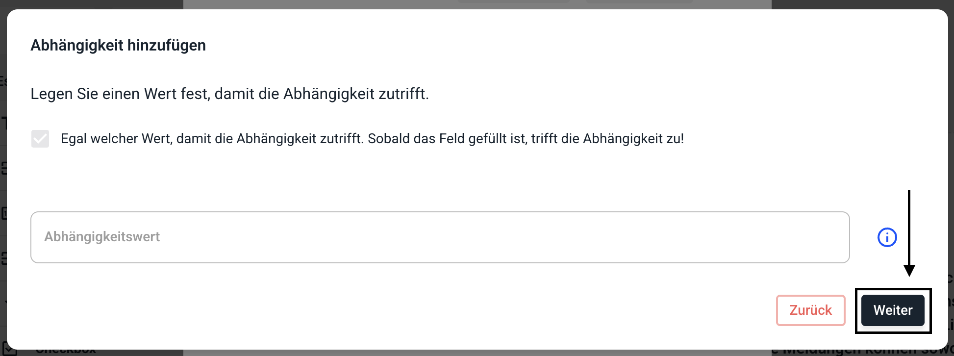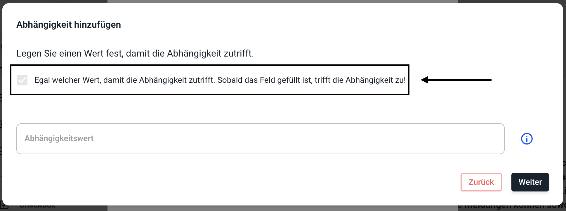 Wählen Sie nun aus, dass unabhängig vom Wert im Feld die Abhängigkeit zutreffen soll.