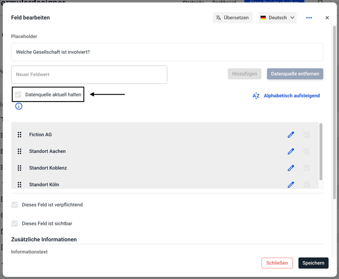 Klicken Sie auf die Checkbox Datenquelle aktuell halten.