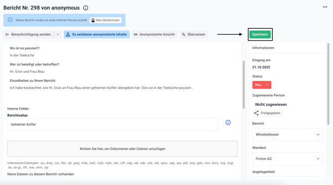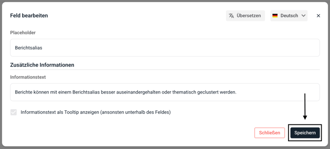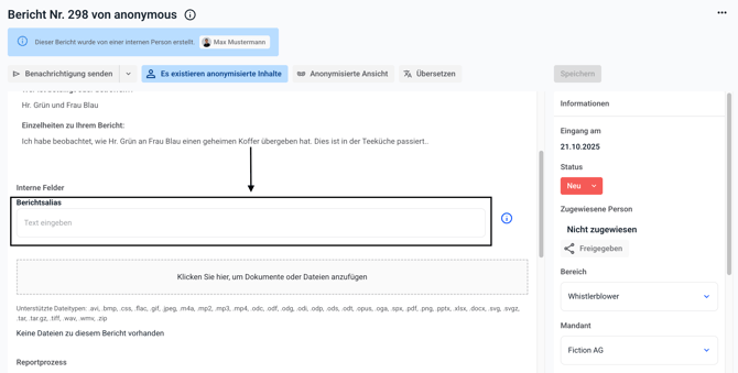 Der Berichtsalias wird unter den Berichtsinformationen angezeigt und kann dort intern bearbeitet werden.